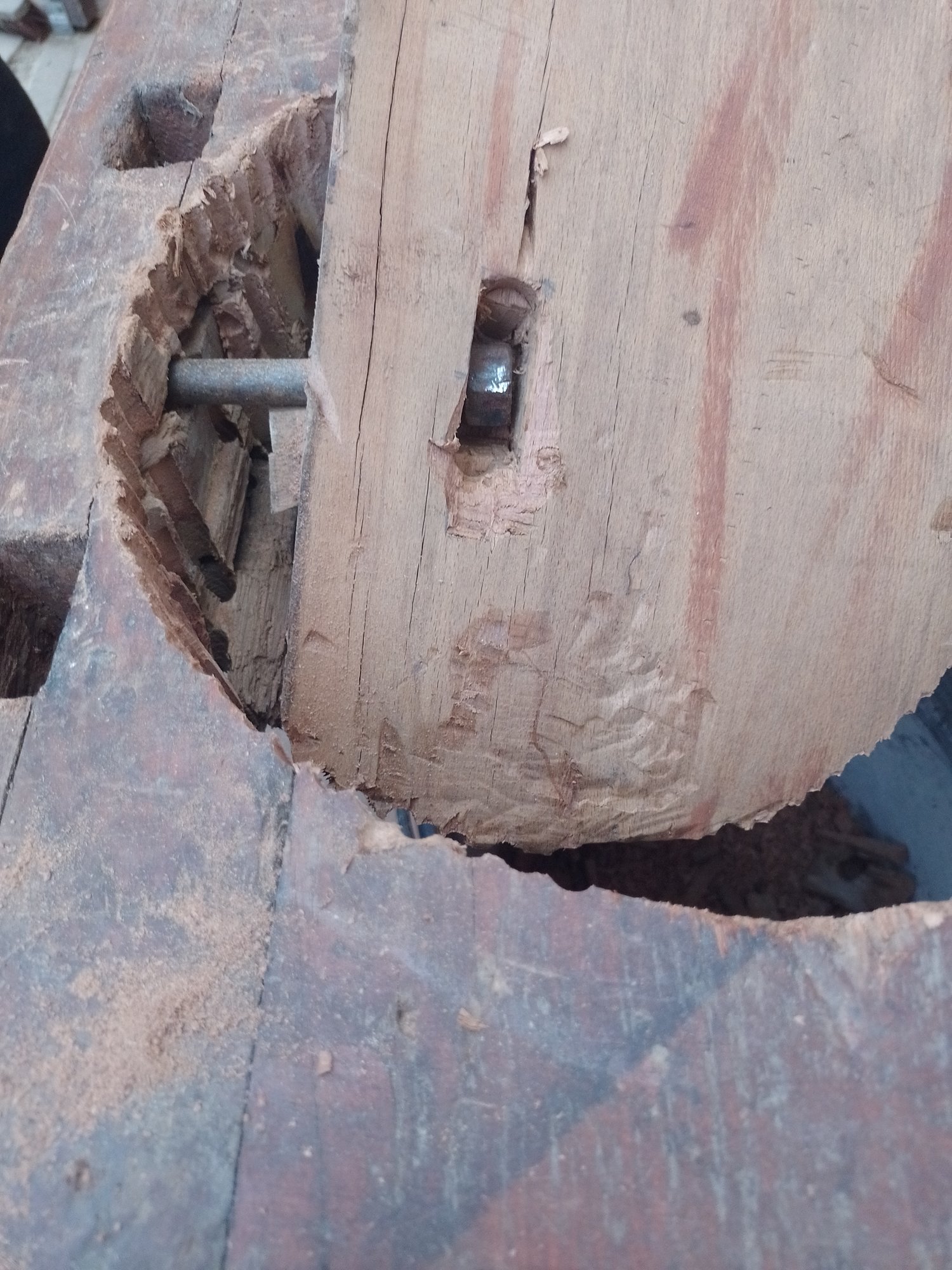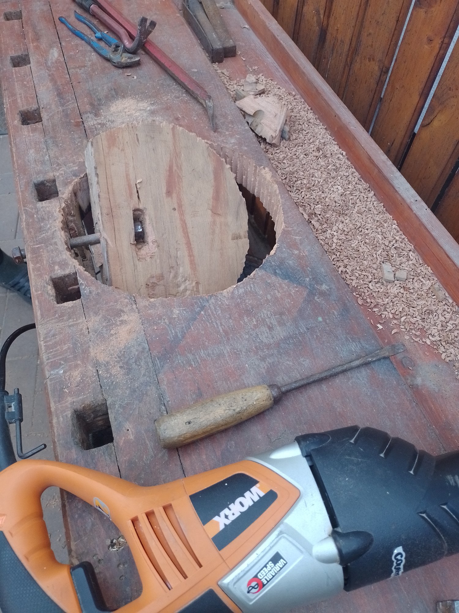 • Heute haben wir schonmal für die Spülschüssel das Loch in der Werkbank gesägt, aber genau an dieser Stelle war eine riesen Schraube mit Mutter, das wussten wir nicht, das war eine Operation, bis das Teil raus war, das Holz ist sehr gut und hart, morgen geht's weiter