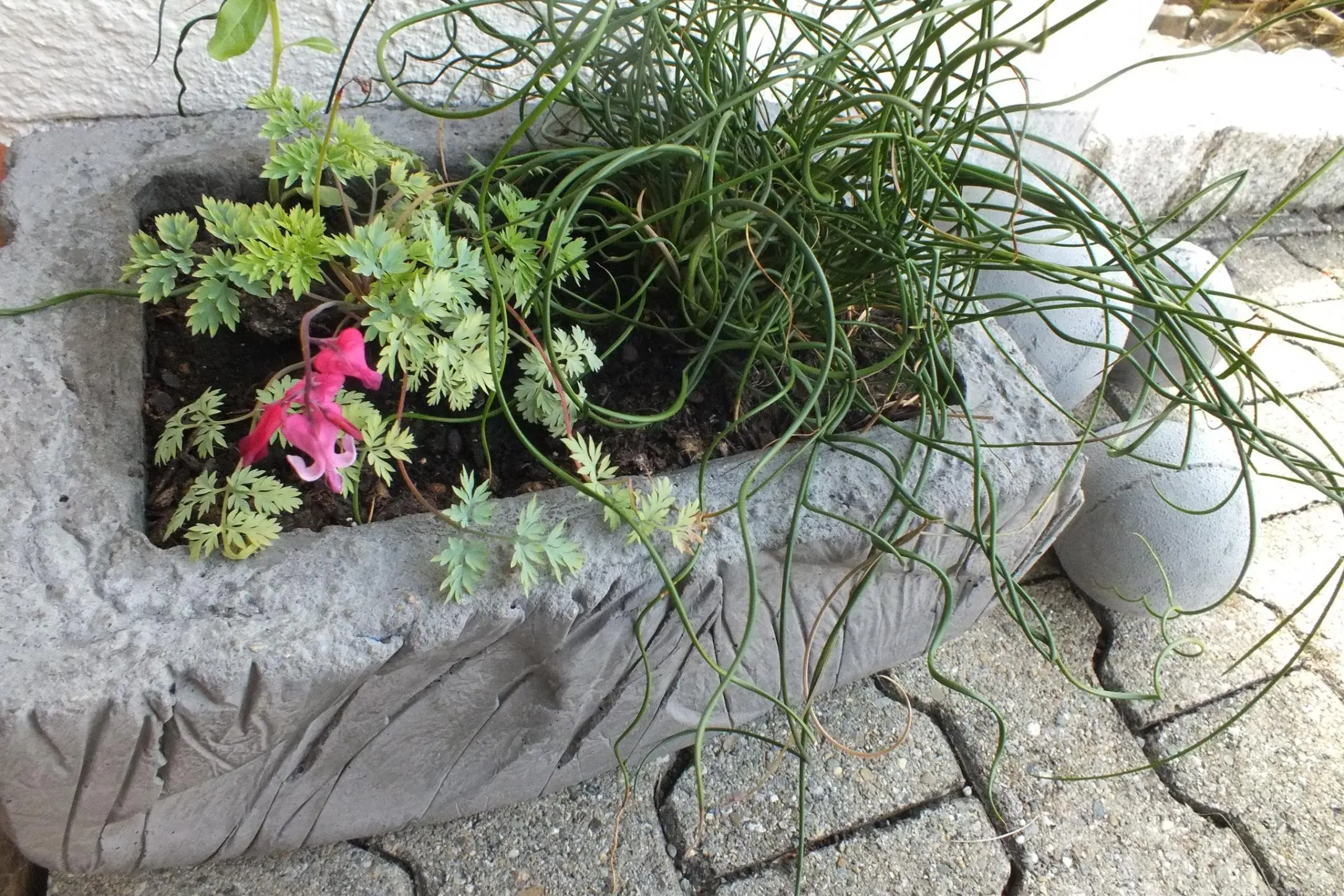 Im Trog wächst bei mir Juncus effusus Spiralis, zusammen mit einem Minitränenden Herzen, das bis vor kurzem noch blühte. :D