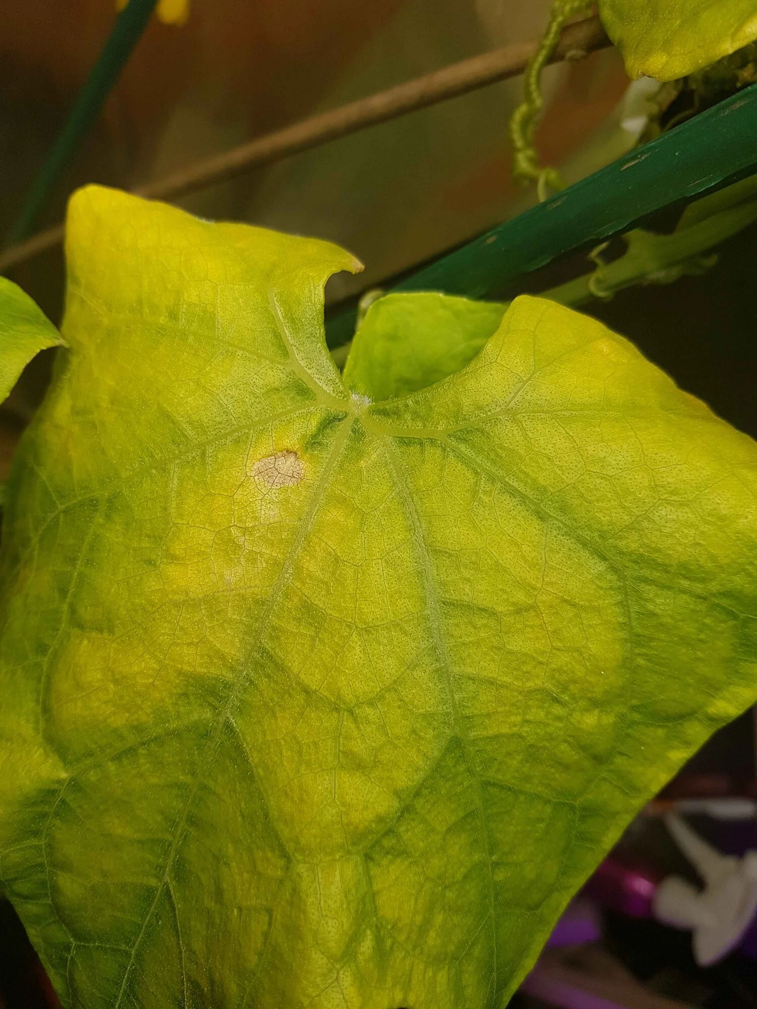 Wenn es bei der Chayote Eisenmangel ist, ist er sehr stark fortgeschritten, da schon die Blattadern ihr Grün teilweise verloren haben.