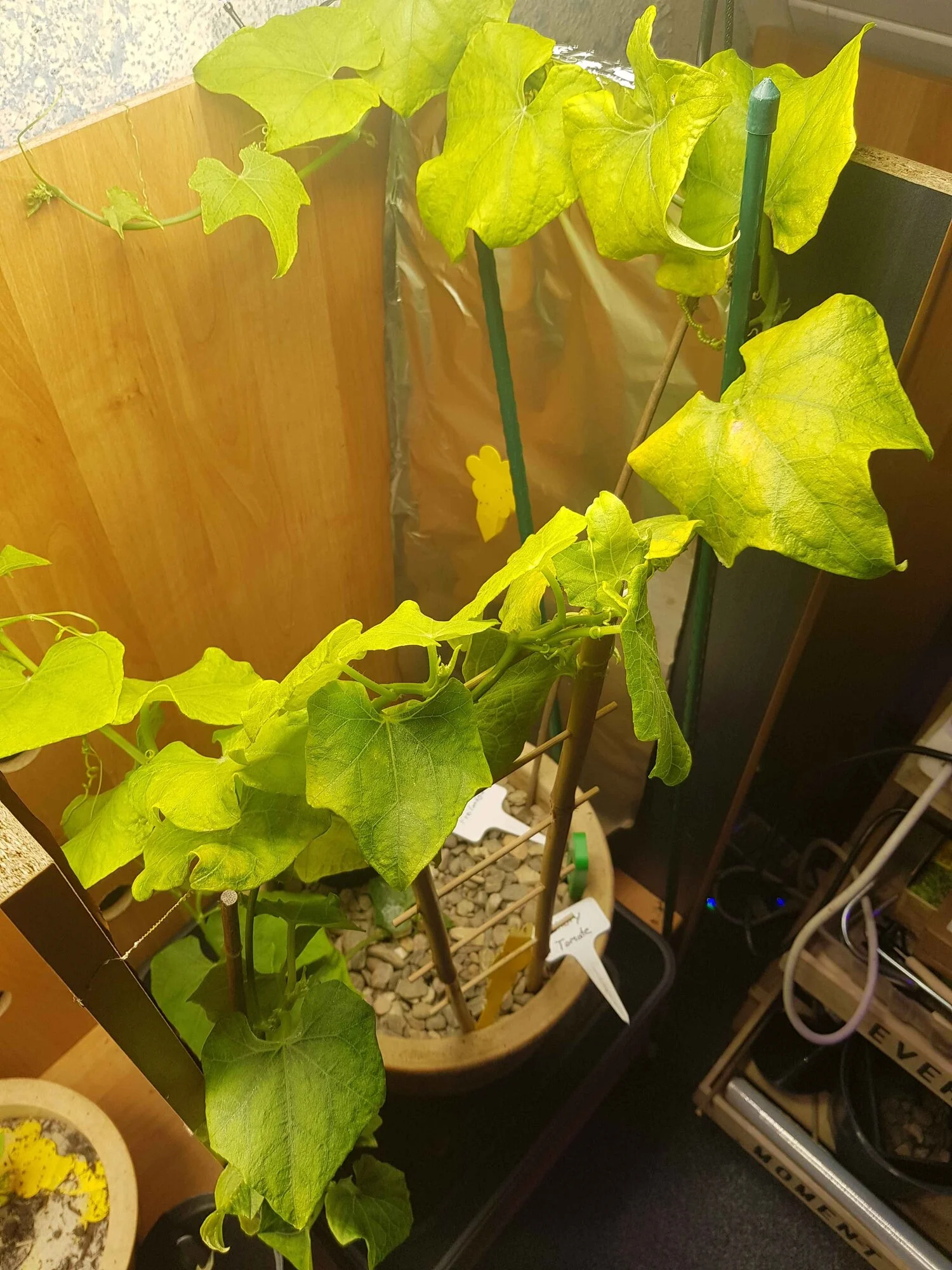 Aktuell hat die Chayote den Haupttrieb der um 1 Blatt alle schätzungsweise 2 Tage wächst, + 3 seitentriebe die jeweils ähnlich schnell wachsen. Vllt wächst sie schneller als der Dünger ausreicht?