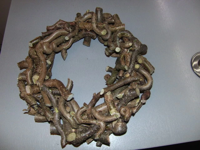 Diesen "Grundstock" evt. mit Mühlenbeckia (gibts im Bastelbedarf) oder Birkenreisig umwickeln (der Ring fällt dann nicht mehr so ins Auge), mit Draht fixieren und dann die Aststückchen mit der Heißklebepistole verteilen und fixieren.