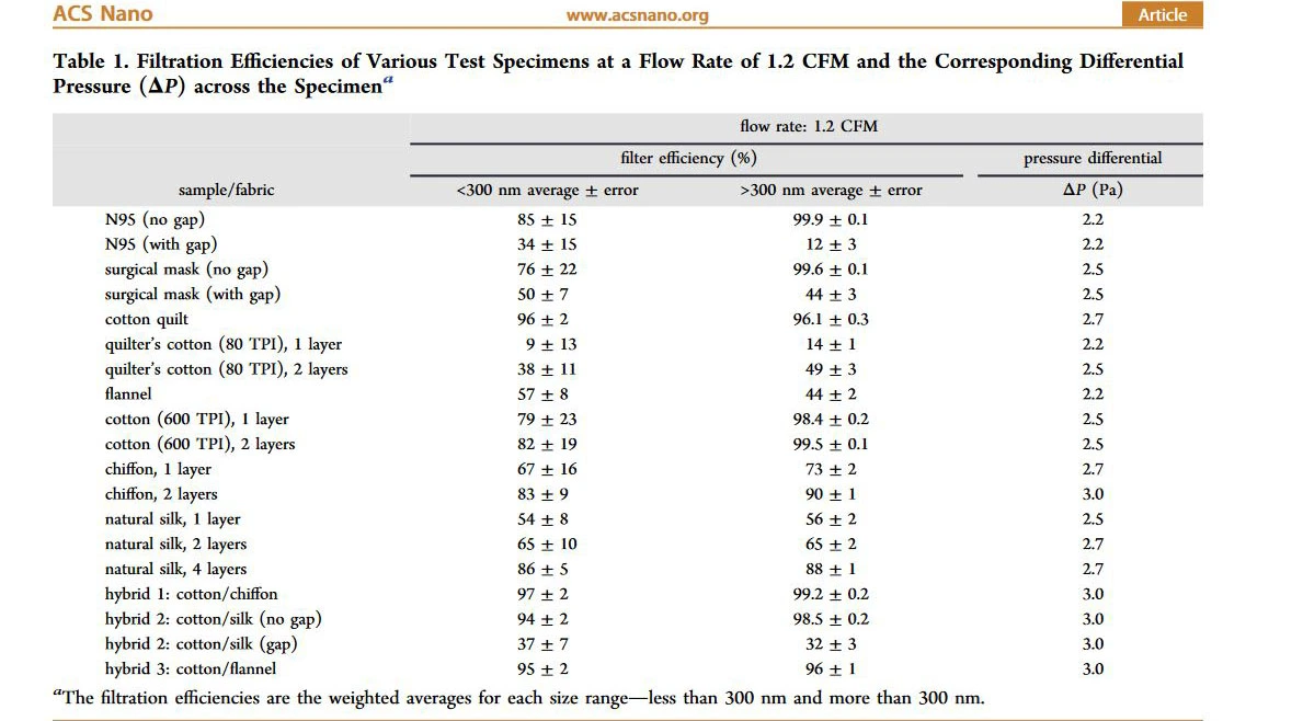 Quelle: Aerosol Filtration Efficiency of Common Fabrics Used in Respiratory Cloth Masks