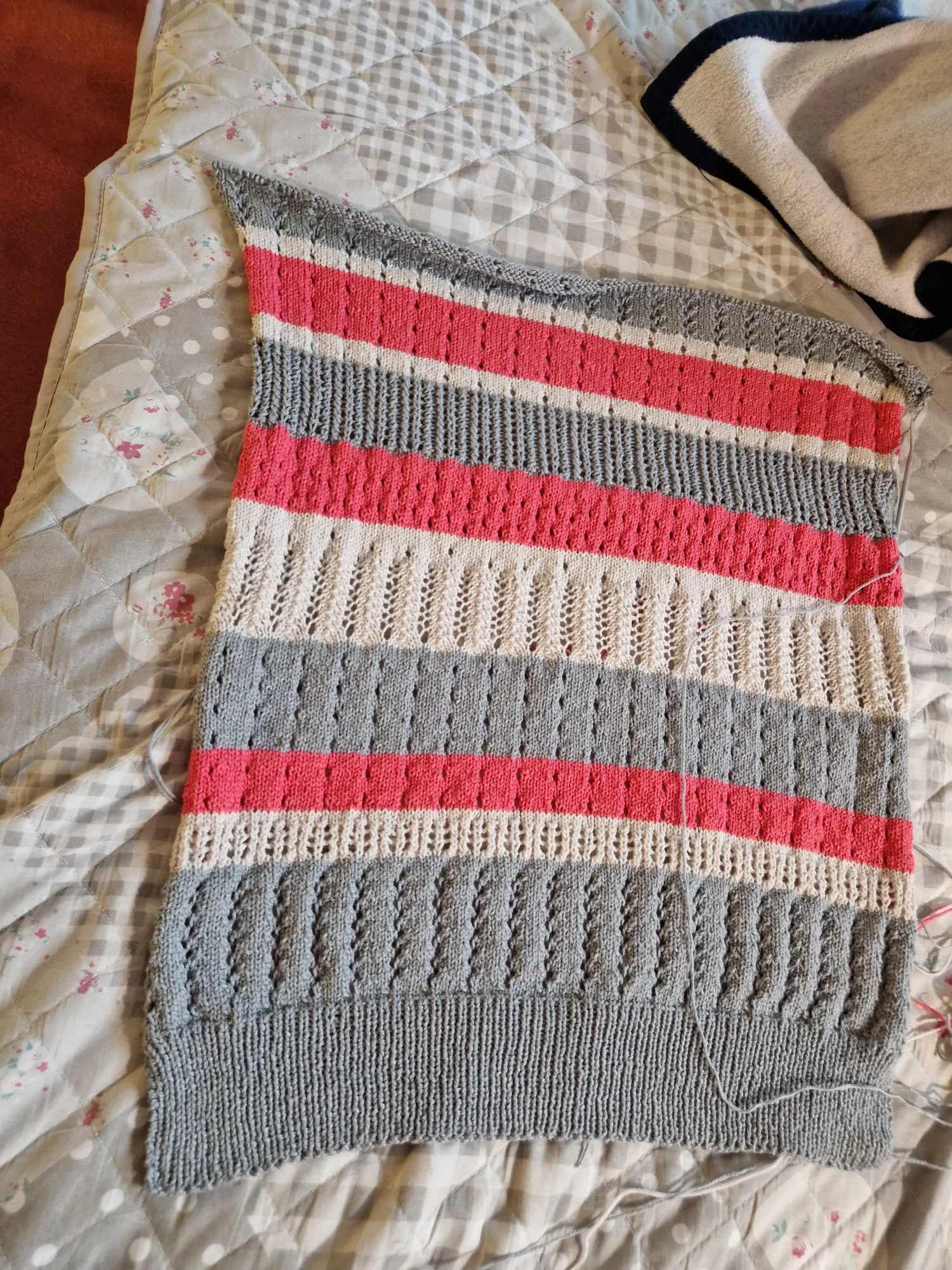 Jetzt überlege ich, mit welcher Farbe ich ende. Auf das Rot mag ich nicht verzichten, müßte aber an der oberen roten Kante doe ersten Abnahmen für den Halsausschnitt machen. Das Bündchen dann wieder in grau.