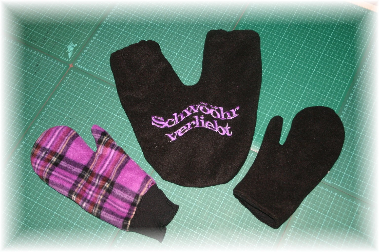 Partnerhandschuhe und die passenden Fäustlinge dazu, sie sind zum wenden also kariert oder einfach schwarz je nach Laune.