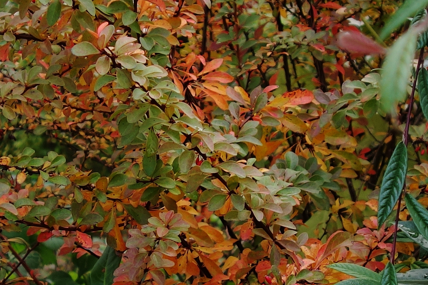 Diese Schneeballart ist immergrün, beteiligt sich am Herbstzauber also nur höchst mäßig, aber wenn schon mal einzelne Blätter mitspielen, dann auch gleich mit Knallfarbe!