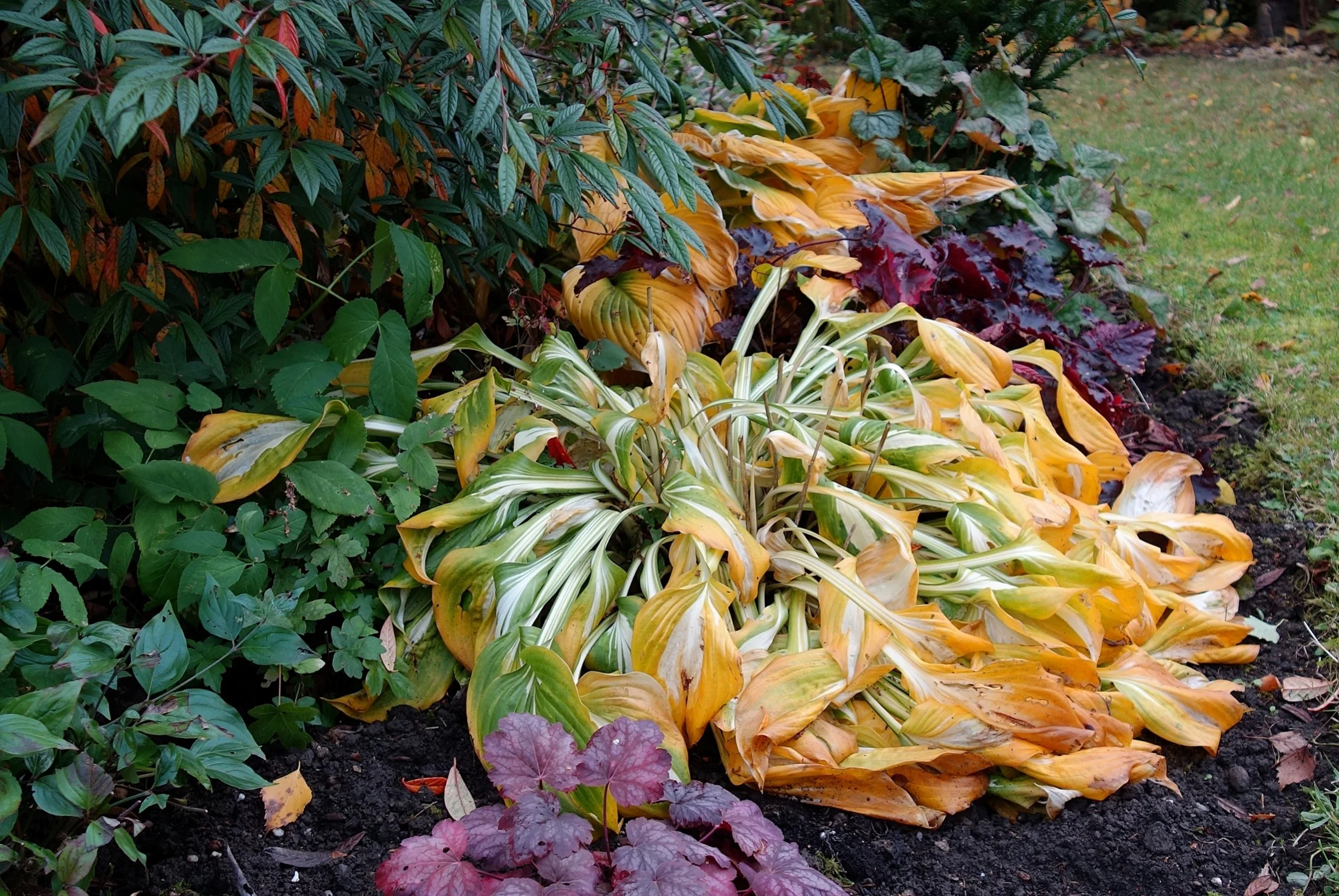 Während die eine Hosta sich noch arglos als buntgelber Teppich ergießt, liegt die andere schon endgültig am Boden.