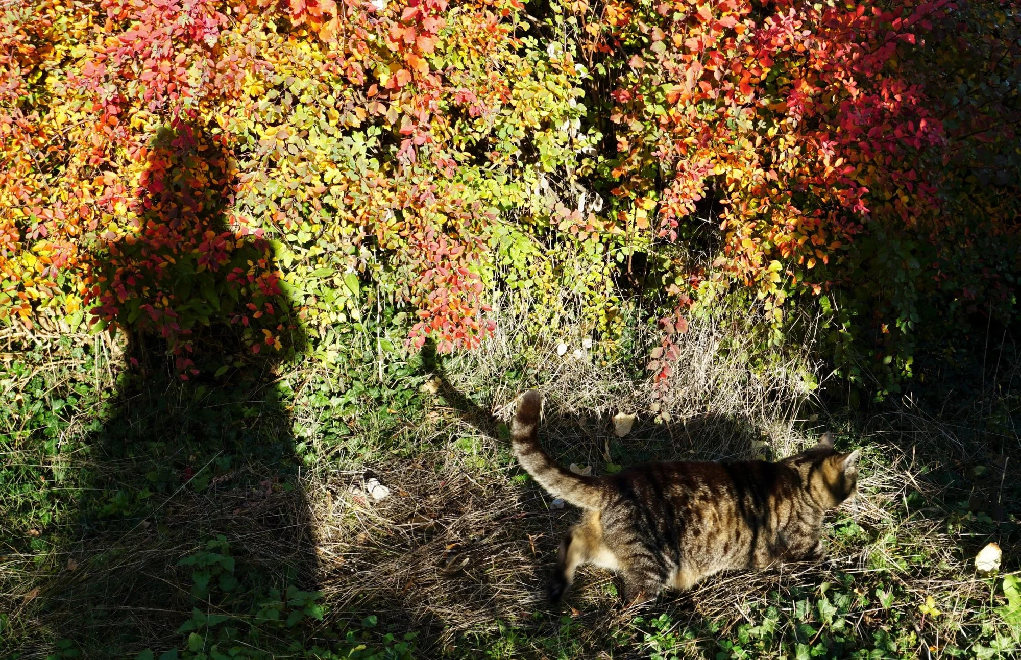 BesteKatzeDerWelt streift durchs abendlich besonnte Herbstgesträuch,