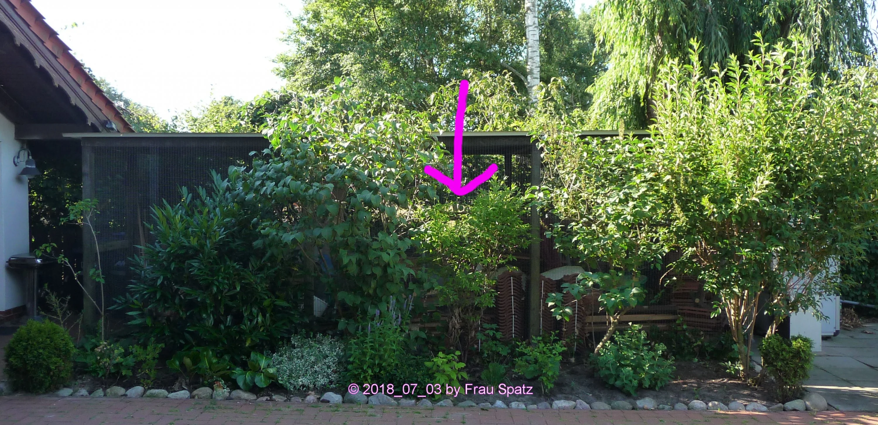 Beet an der Voliere, wo der wundersame Blaubeerenstrauch wächst (rosa Pfeil).