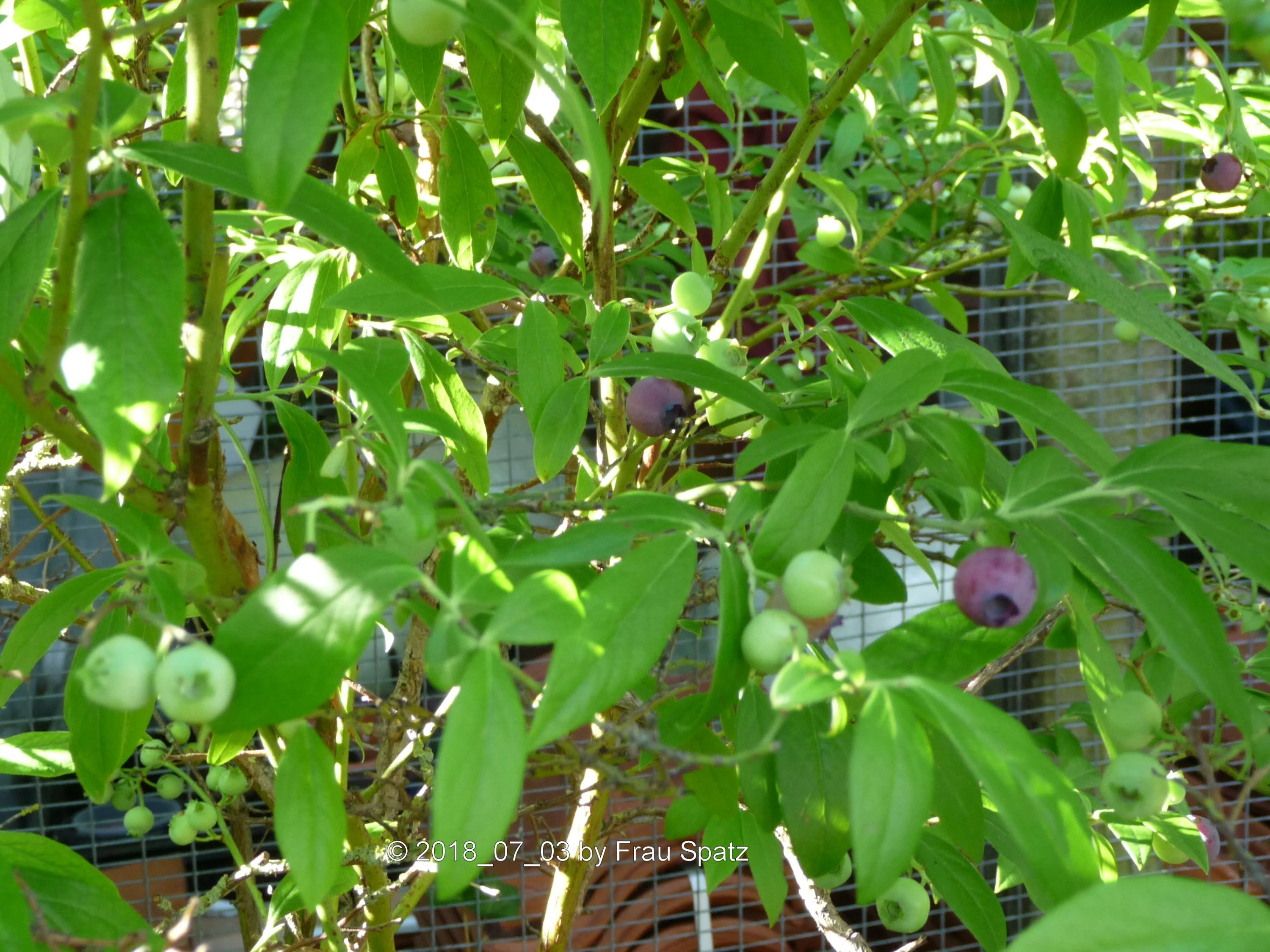 Die blauen Murmeln sind mir bisher nicht aufgefallen, da der Strauch direkt an der Voliere steht und beide Flieder recht groß sind. Die Flieder werde ich diese Woche stutzen, damit die Blaubeeren mehr Platz und Sonne bekommen.