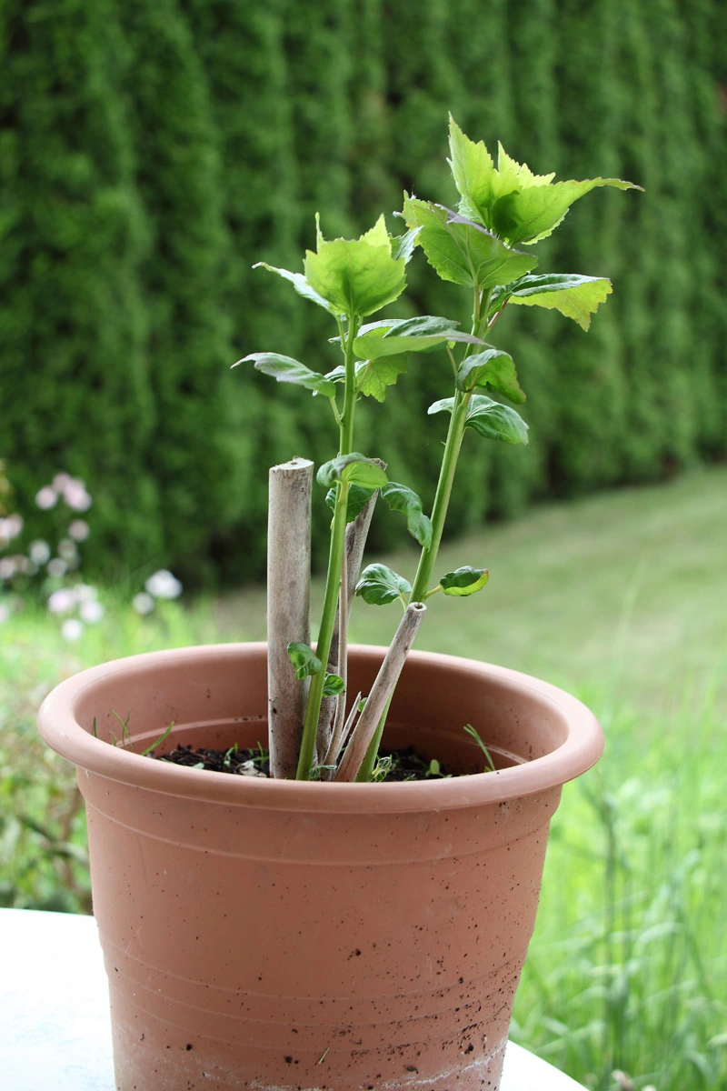 Als ich im März den Sitzplatz ausmotten wollte... Oh schreck! Da steht immer noch der olle Plastiktopf, ungeschützt vor Frost im Pflanzenregal.