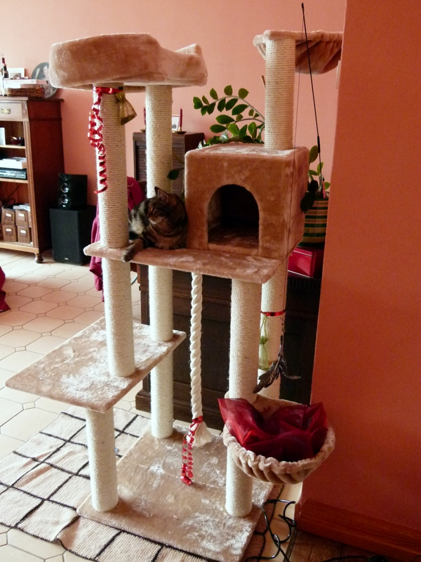 ansonsten habe ich mir bzw. den katzen jetzt so ein plüschmonster namens kratzbaum gegönnt - in der hoffnung, dass vor allem livia in zukunft die stühle in frieden lässt. die nutzt sie vorzugsweise zum krallenschärfen. carlo ist in der hinsicht schon immer brav, er scheint einen hang zu sisal zu haben :D folglich liebt er meine sisal-abtreter, die er gern benutzen darf. aber kaum hatte ich das teil zusammengeschraubt, schrubbte er seine pfoten über die stangen: braver junge! livia nutzt das teil derzeit nur zum rumlümmern, aber ich habe so säckchen mit katzenminze angebunden - die hoffnung stirbt zuletzt :D
