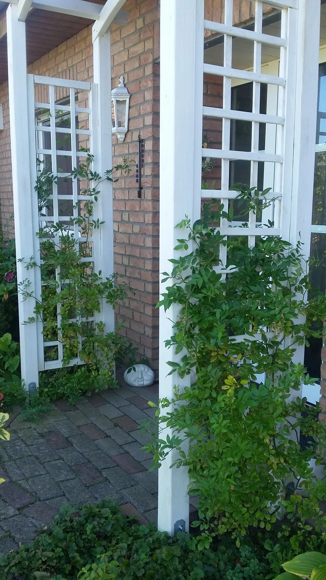 Die Kletterhortensie ist ok. Ich könnte mir eher ein kleinblättriges, weiß-grünes Efeu dort vorstellen und zu Weihnachten hängst du eine Lichterkette mit vielen Minilichtern rein. Oder den Bogen an eine bessere, d.h. sonnigere Stelle versetzen.