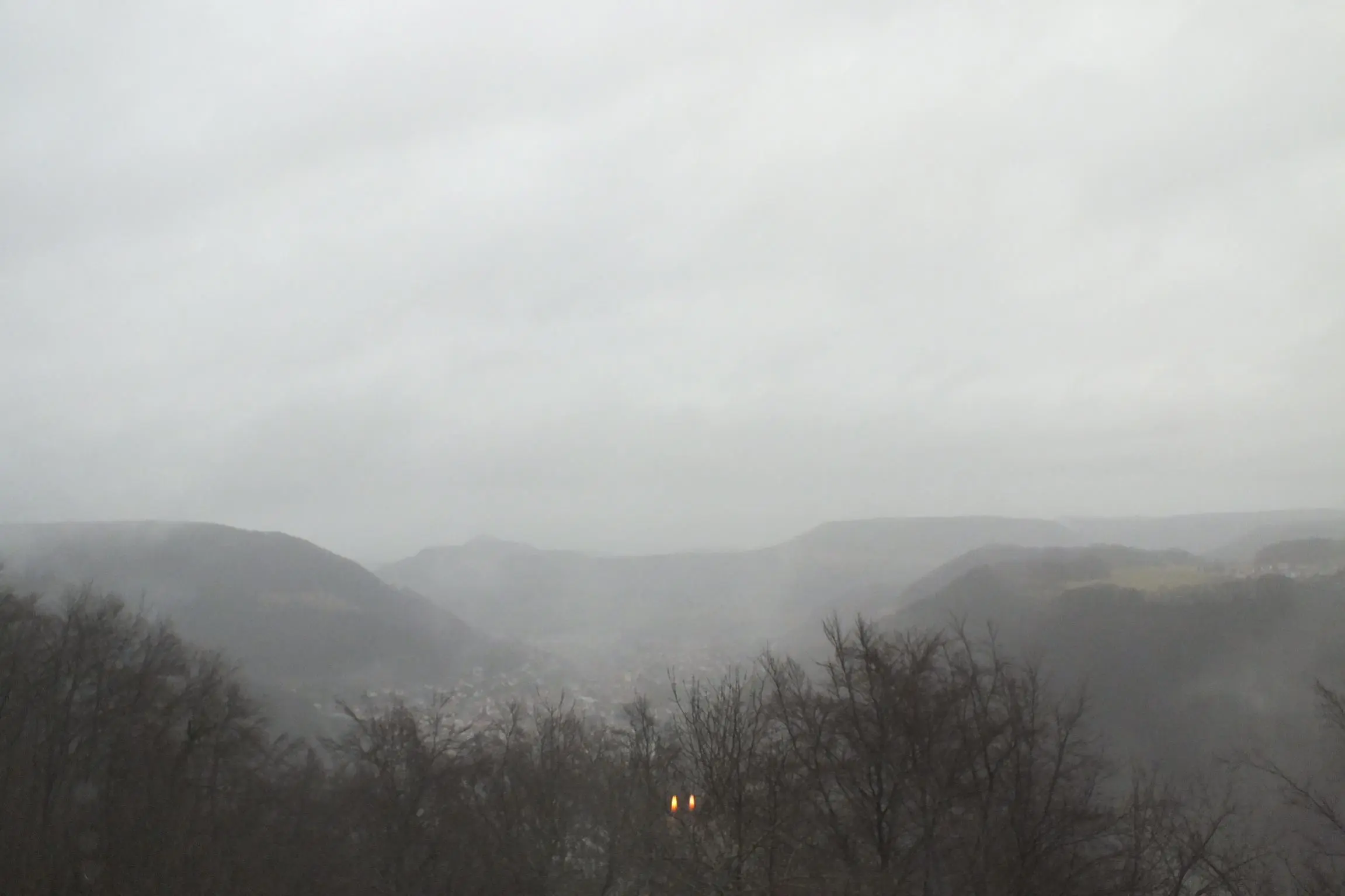 Der Sturm hat den Schnee von den Bäumen geweht und die Sonne lässt sich nur für wenige Minuten am Tag durch den Nebel erkennen.
