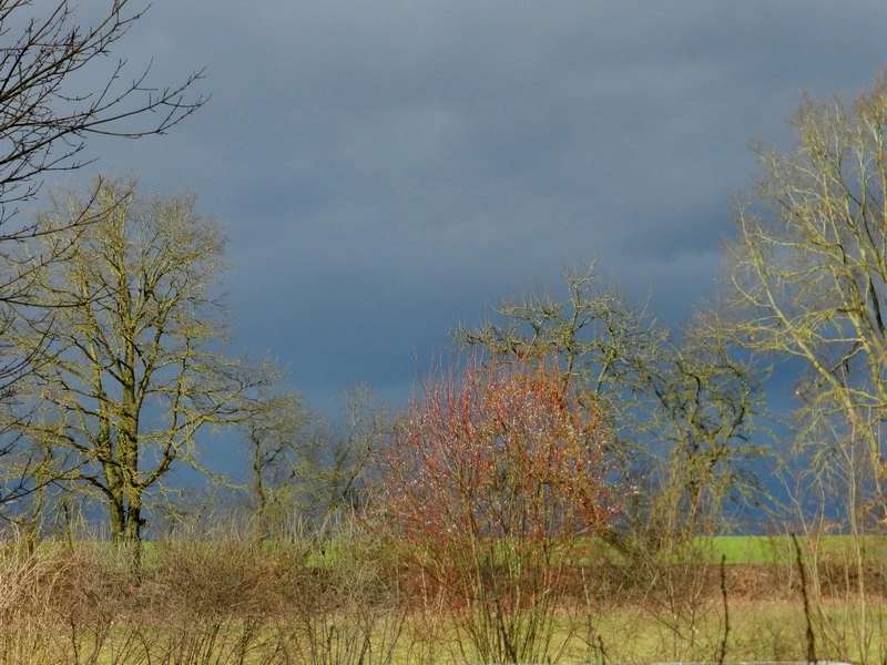 Die Sonne fand ganz kurz eine kleine Lücke in dem dichten Gewölk und ließ die Bäume und das Gras vor dem schwarzen Himmel aufleuchten.