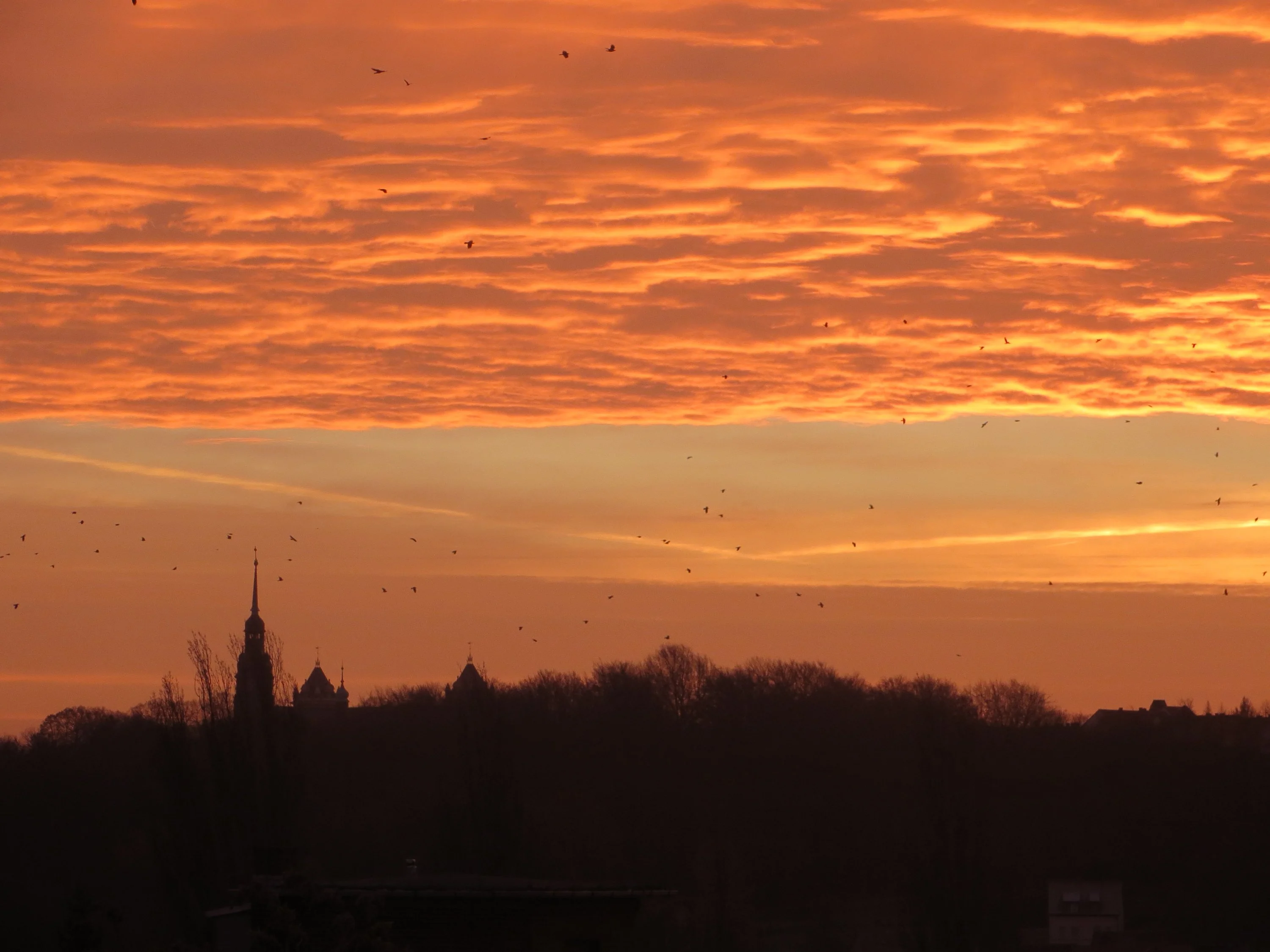 Gehören Regenbögen nicht an den Abendhimmel? :dAber jetzt geht's los: der Regen, der zu dem Spektakel gehört, zieht aus derselben Richtung rasch heran und wird im Näherkommen immer lauter, bis er mir auf's Dachfenster knattert. Der Regenbogen zerläuft eilig und plötzlich ist der Himmel komplett universalgrau. (Blieb leider den Rest des Tages auch so.