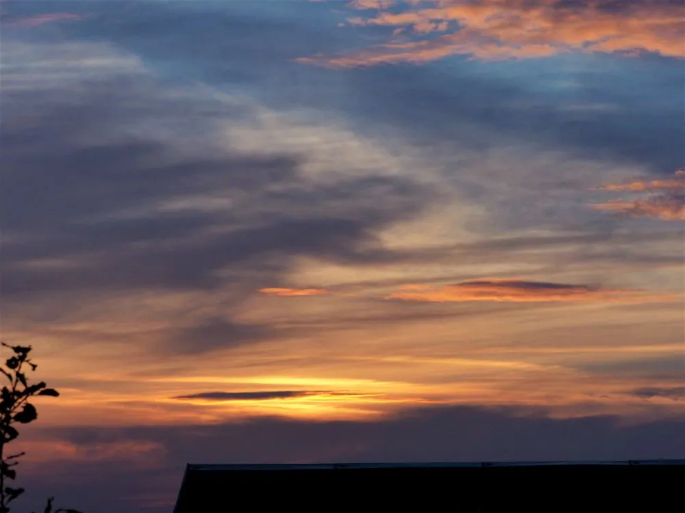 Gestern gab's einen hübschen Westhimmel. Alt- und Neubauten verschwammen gemeinschaftlich in Diesigkeit. Hat mich für etwa 20 Minuten vom Laubsammeln abgehalten. Danach musste ich mich sputen, damit ich noch sehe, was ich da mach...
