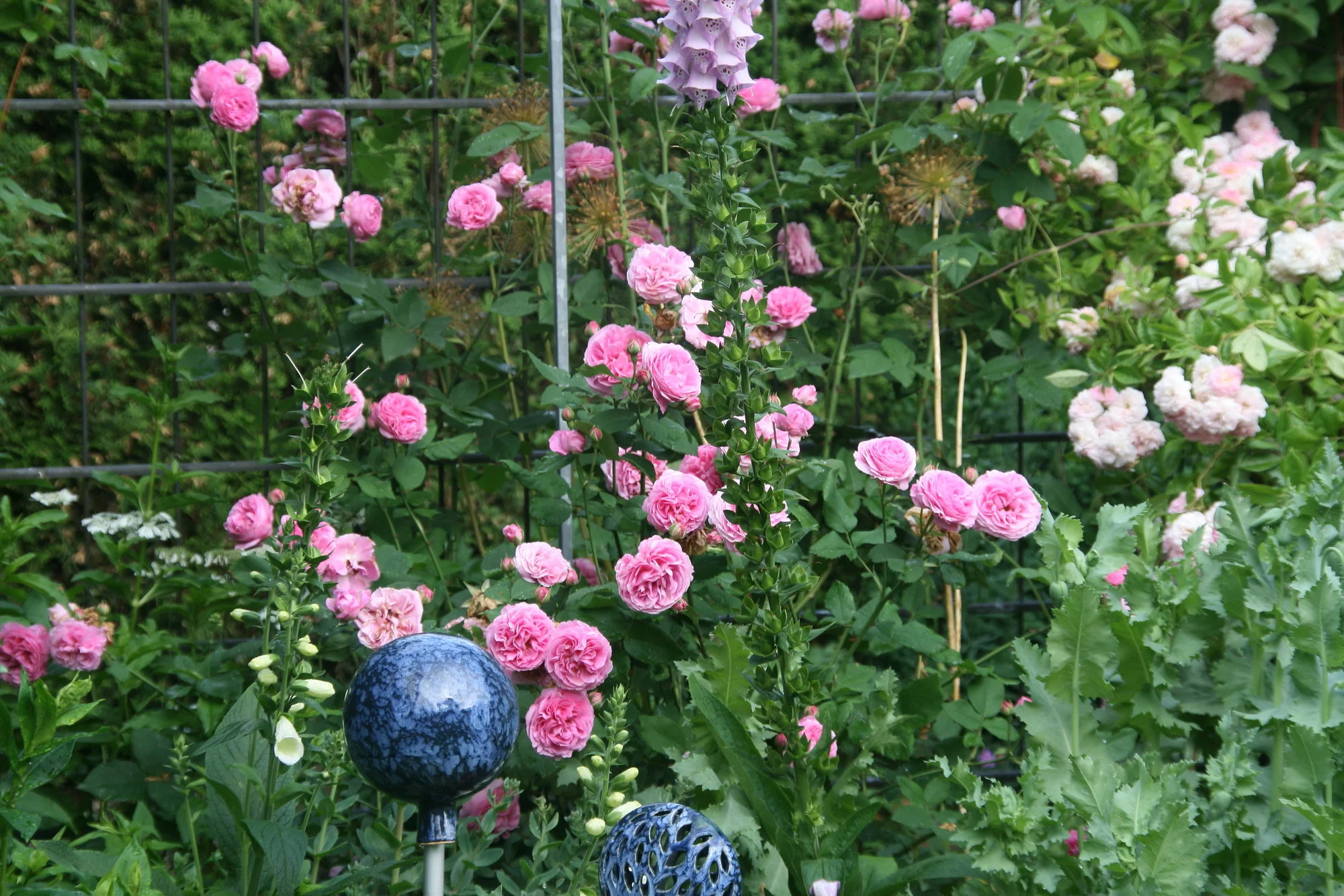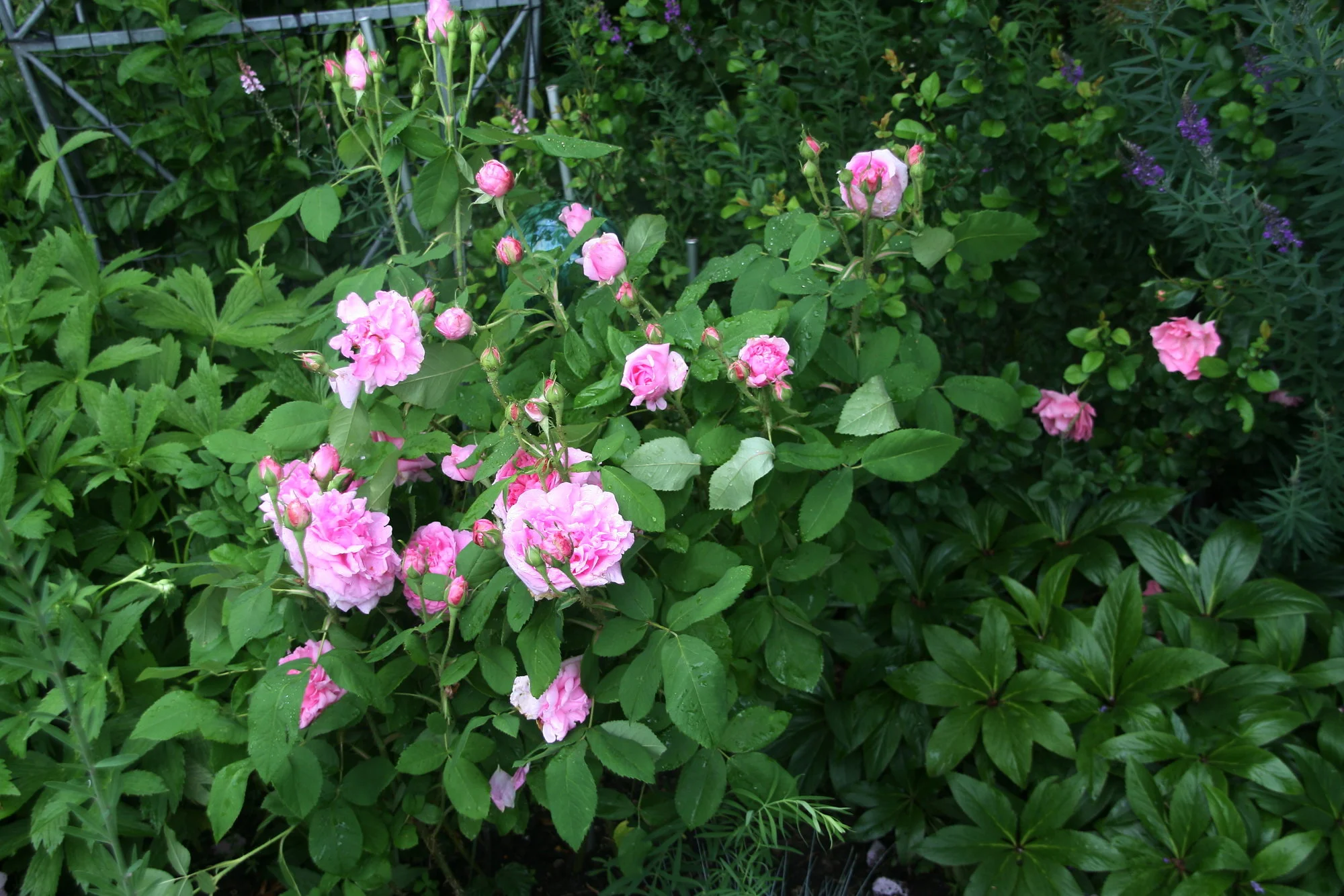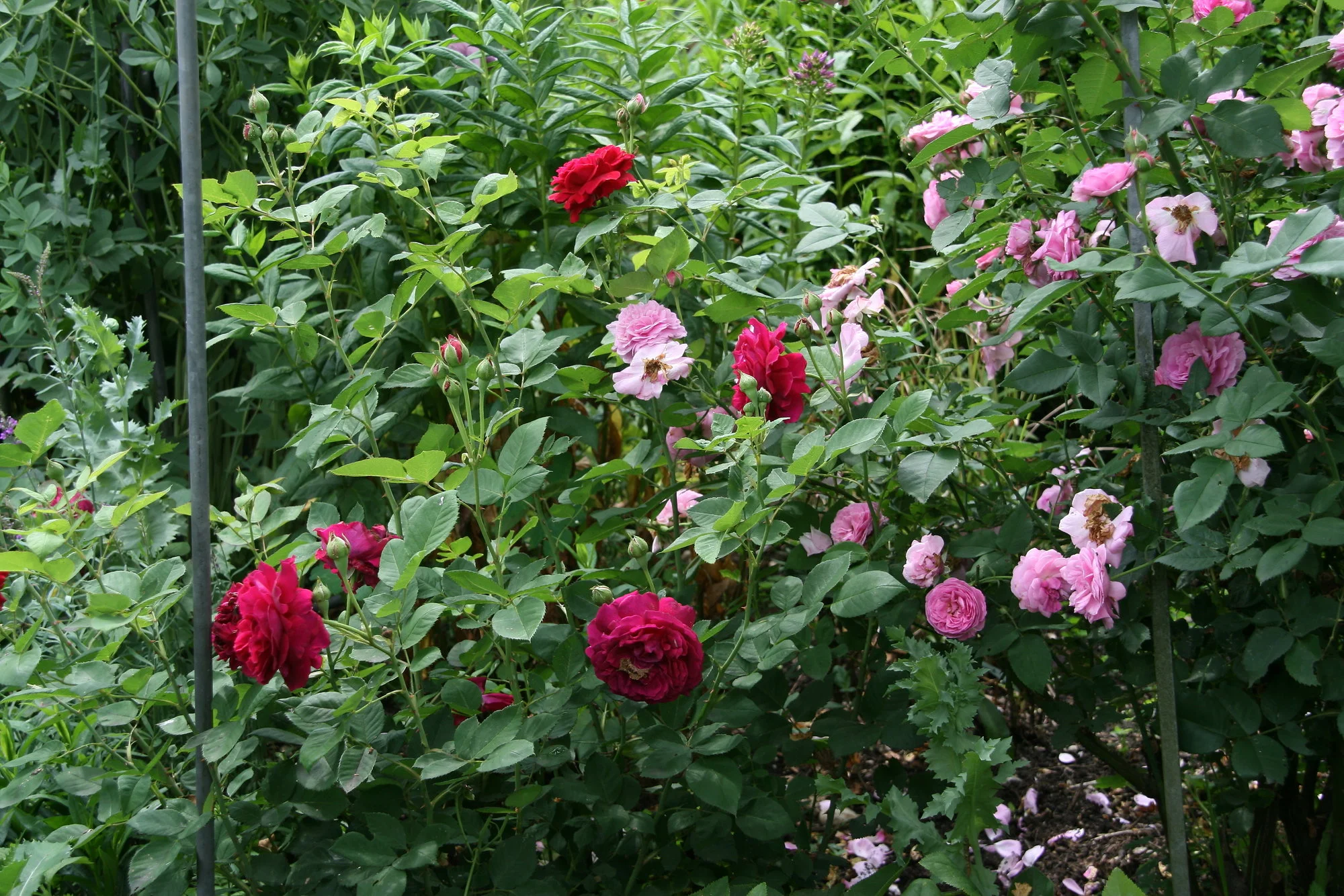 Aber man halt nicht alles haben. Die Louise Odier habe ich ja gleich 3mal, was ich heute nicht mehr machen würde. Aber die stammt noch aus meinen Anfängerjahren, wo man gesagt hat, man sollte 3 Strauchrosen zusammenpflanzen, damit sie einen schönen Habitus machen. Habe meinen Fehler schnell erkannt und sie auseinander gesetzt. Heuer will ich eine als Kletterrose ziehen, die sieht man auf dem letzten Bild an dem Gitter. Die auf dem 5.Bild, die dunkle rechts ist die Alfred Colomb, die ist glaube ich auch historisch. Habe gerade nachgeguckt, die ist historisch, eine sogenannte Remontarose, die blüht sozusagen nach.
