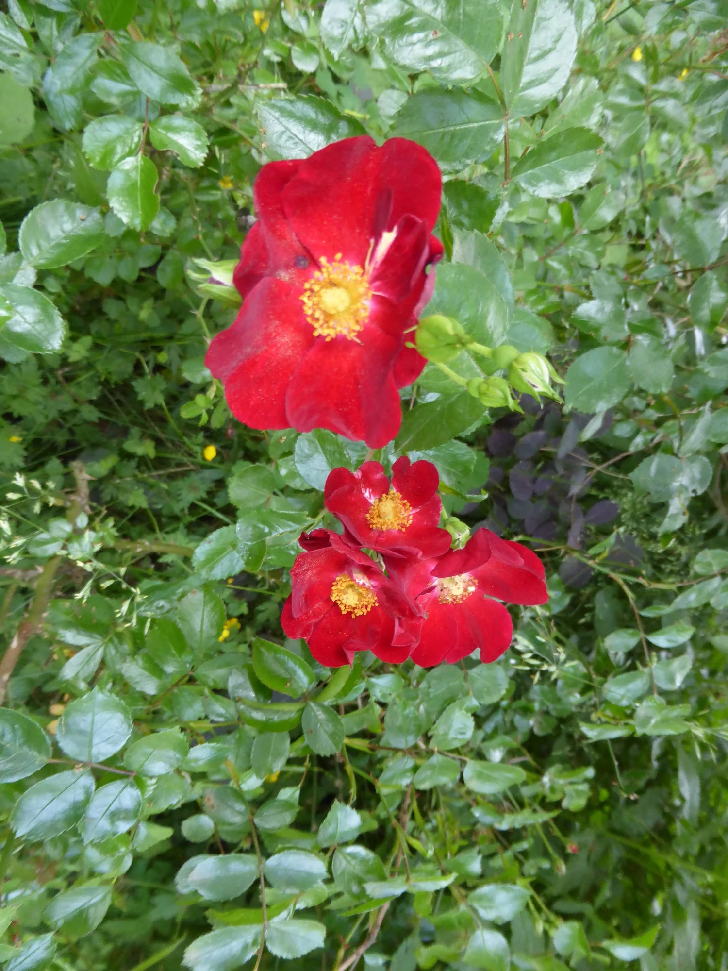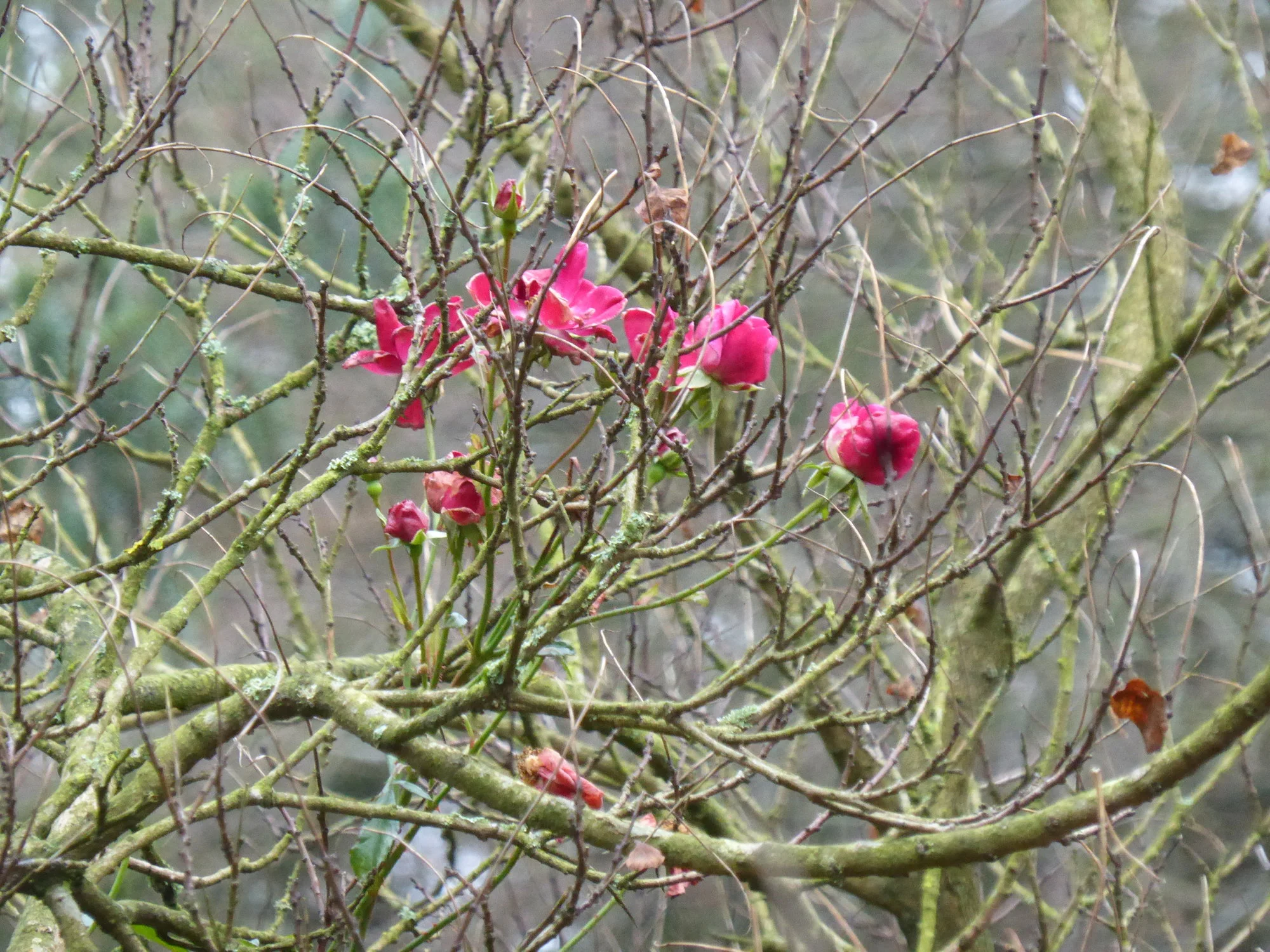 Die rote Wildrose hier ist ganz klein, aber sie klemmt auch etwas unglücklich direkt unterm Perrückenstrauch an der Toreinfahrt - von der anderen Seite machen ein paar Fichten Schatten. Ich weiß nicht, wer die arme Rose dorthin verbannt hat. Aber sie blüht unglaublich langanhaltend, die letzten Blüten habe ich noch im kahlen Perückenstrauch, in den sie hochgerankt ist, im Dezember gefunden.