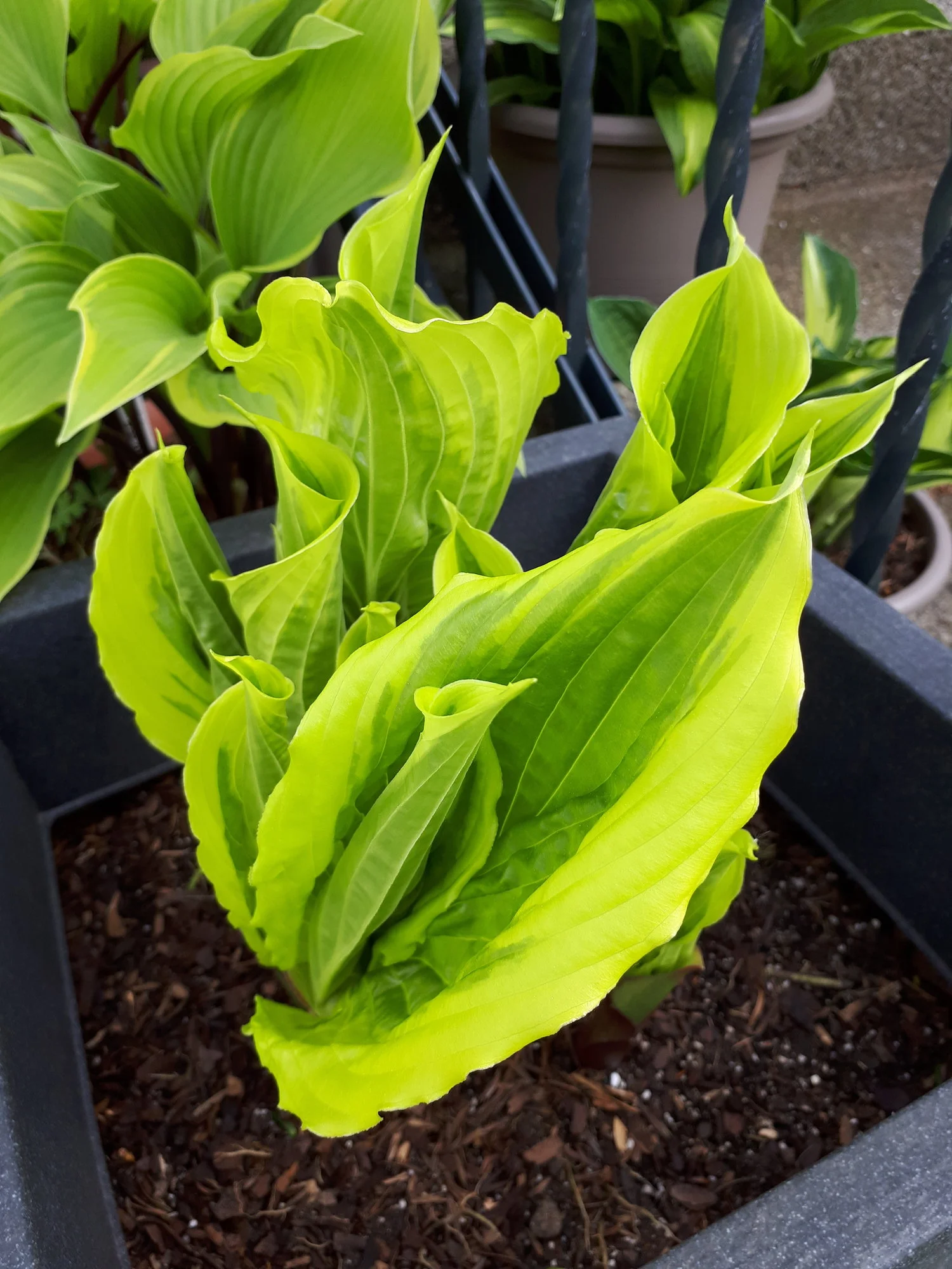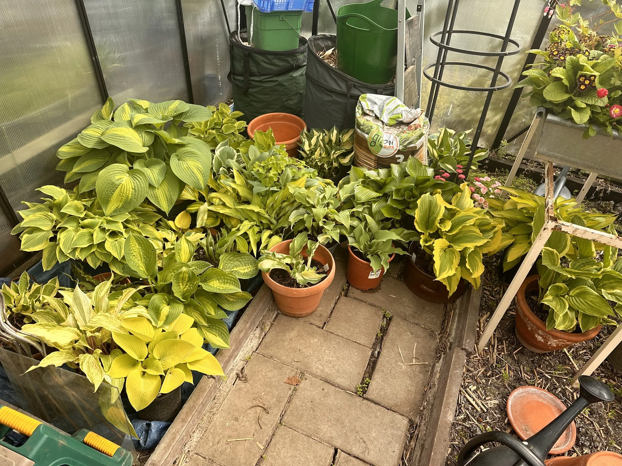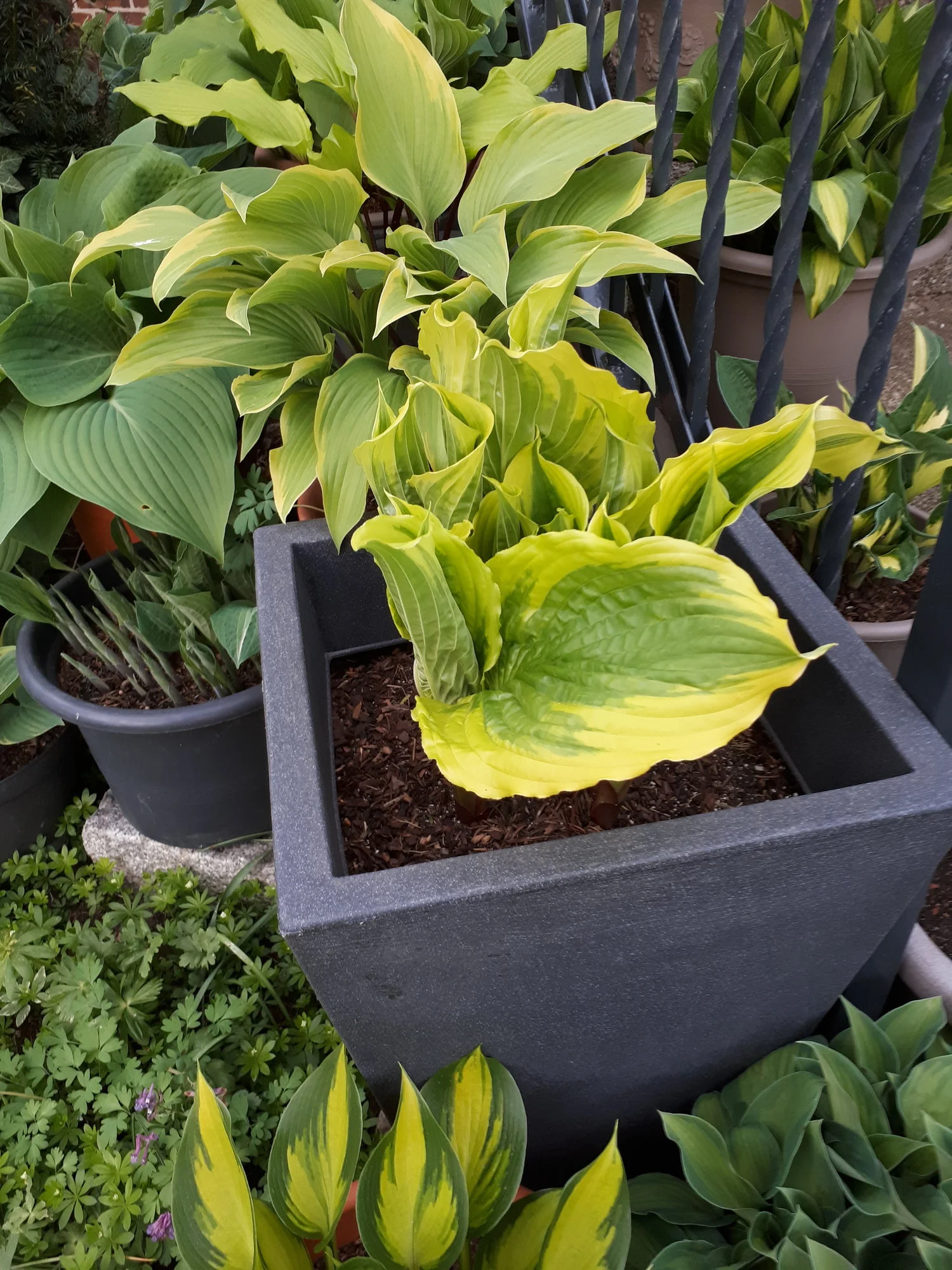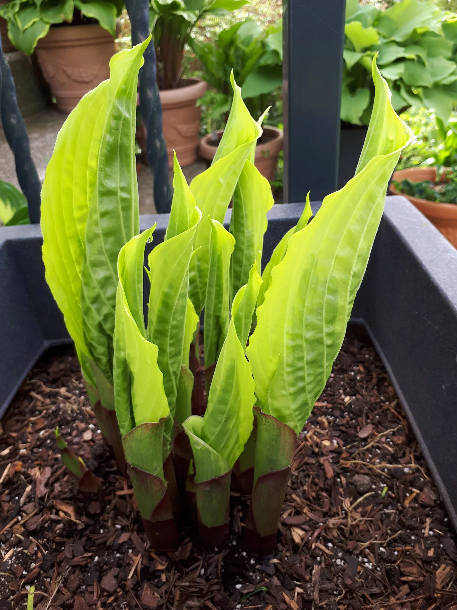 Meine Hostas in Töpfen habe ich weiterhin draußen stehen, auch wenn sie schon teilweise recht weit ausgetrieben sind, ja eine hat sogar schon eine Blüte angesetzt.