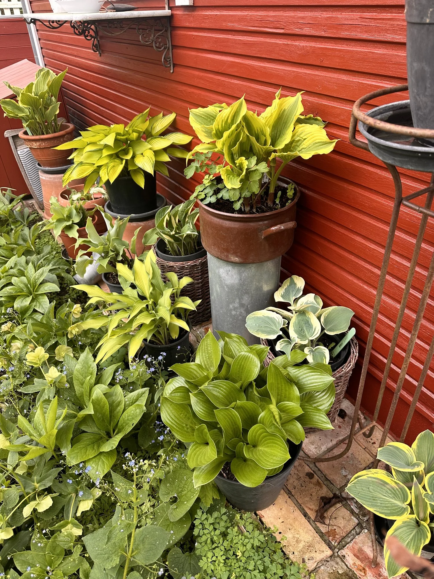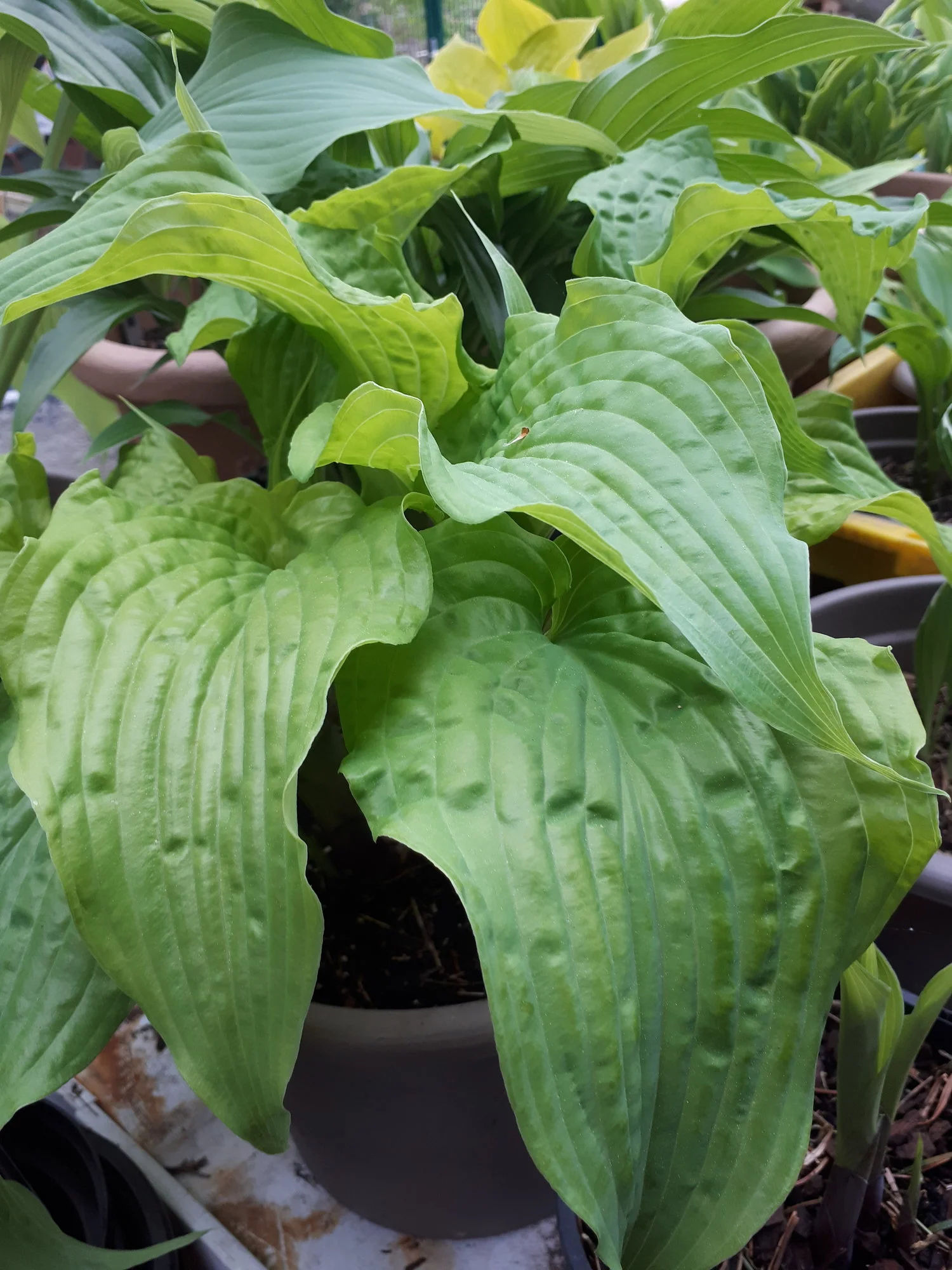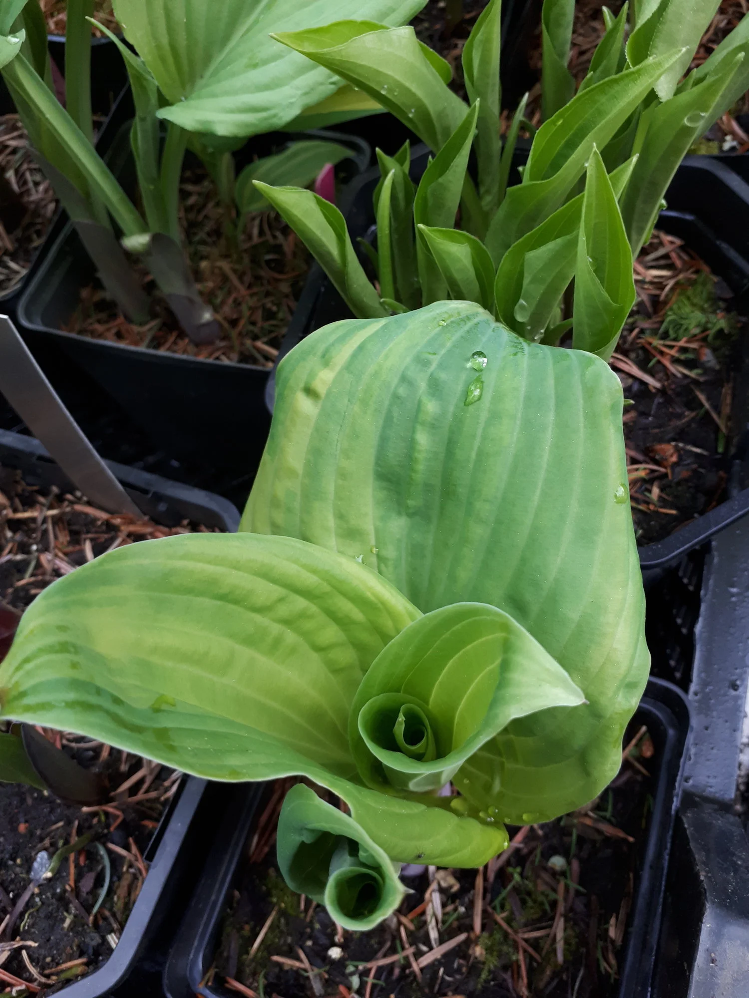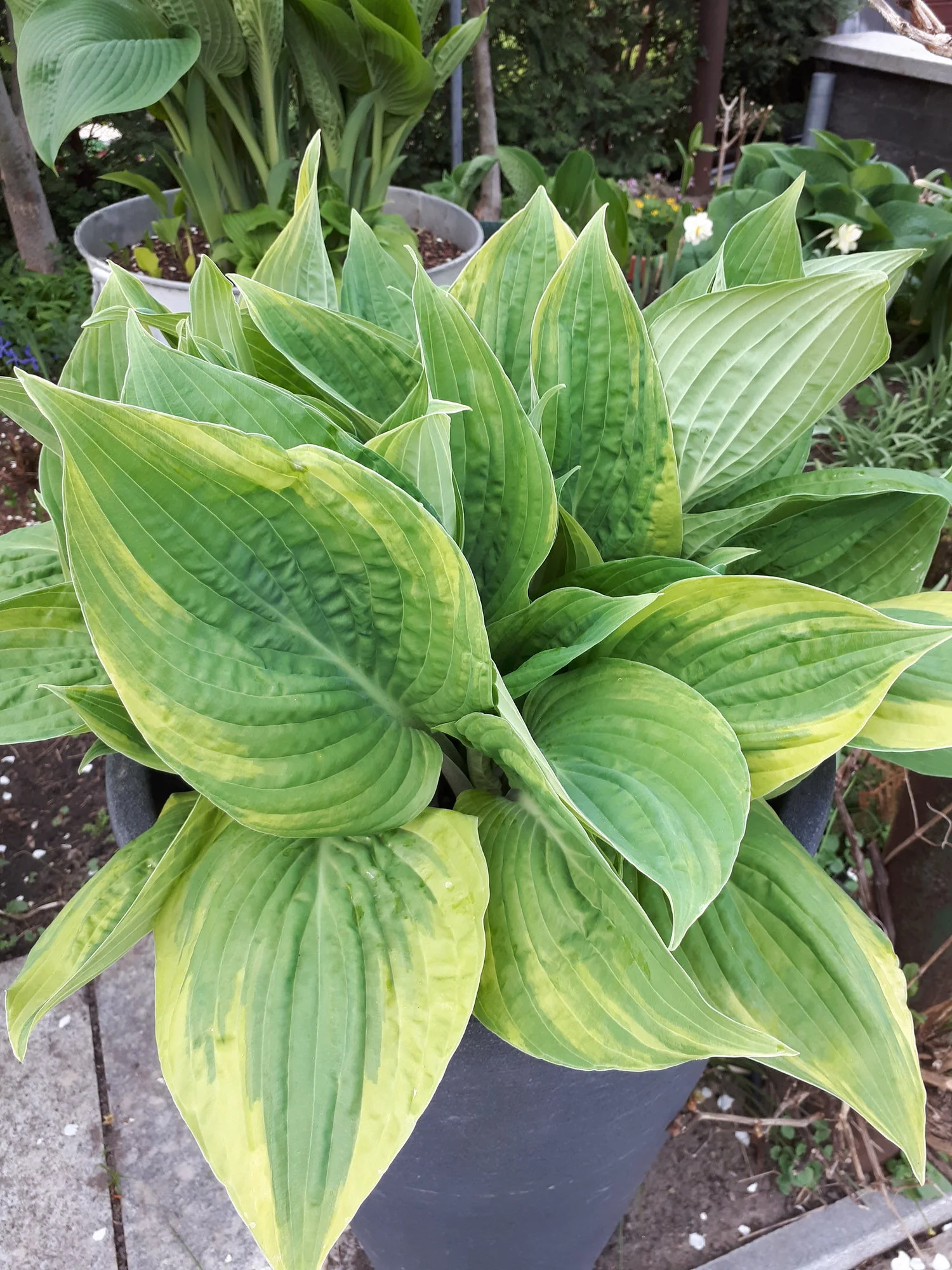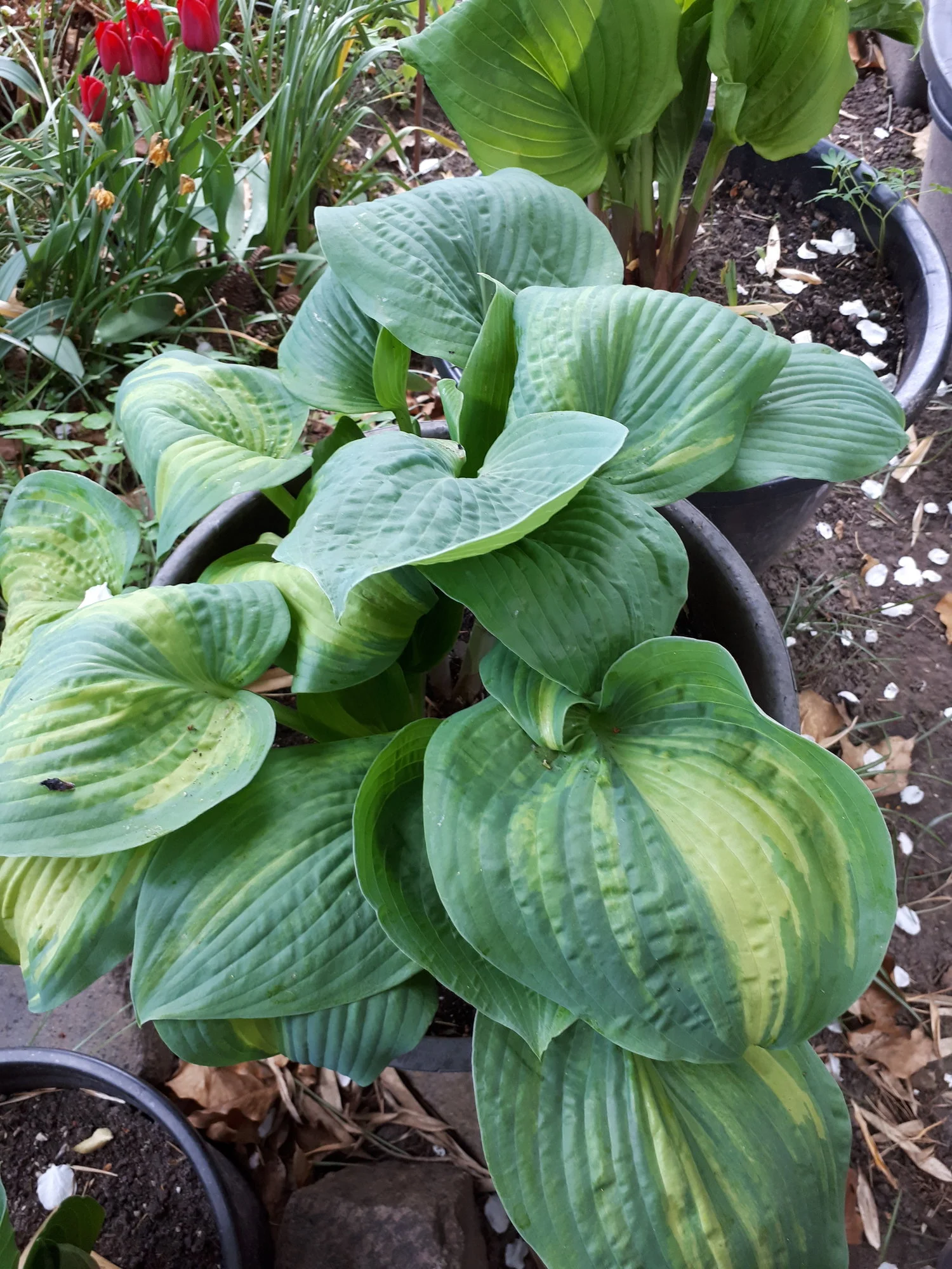 Meine Hostas in Töpfen habe ich weiterhin draußen stehen, auch wenn sie schon teilweise recht weit ausgetrieben sind, ja eine hat sogar schon eine Blüte angesetzt.