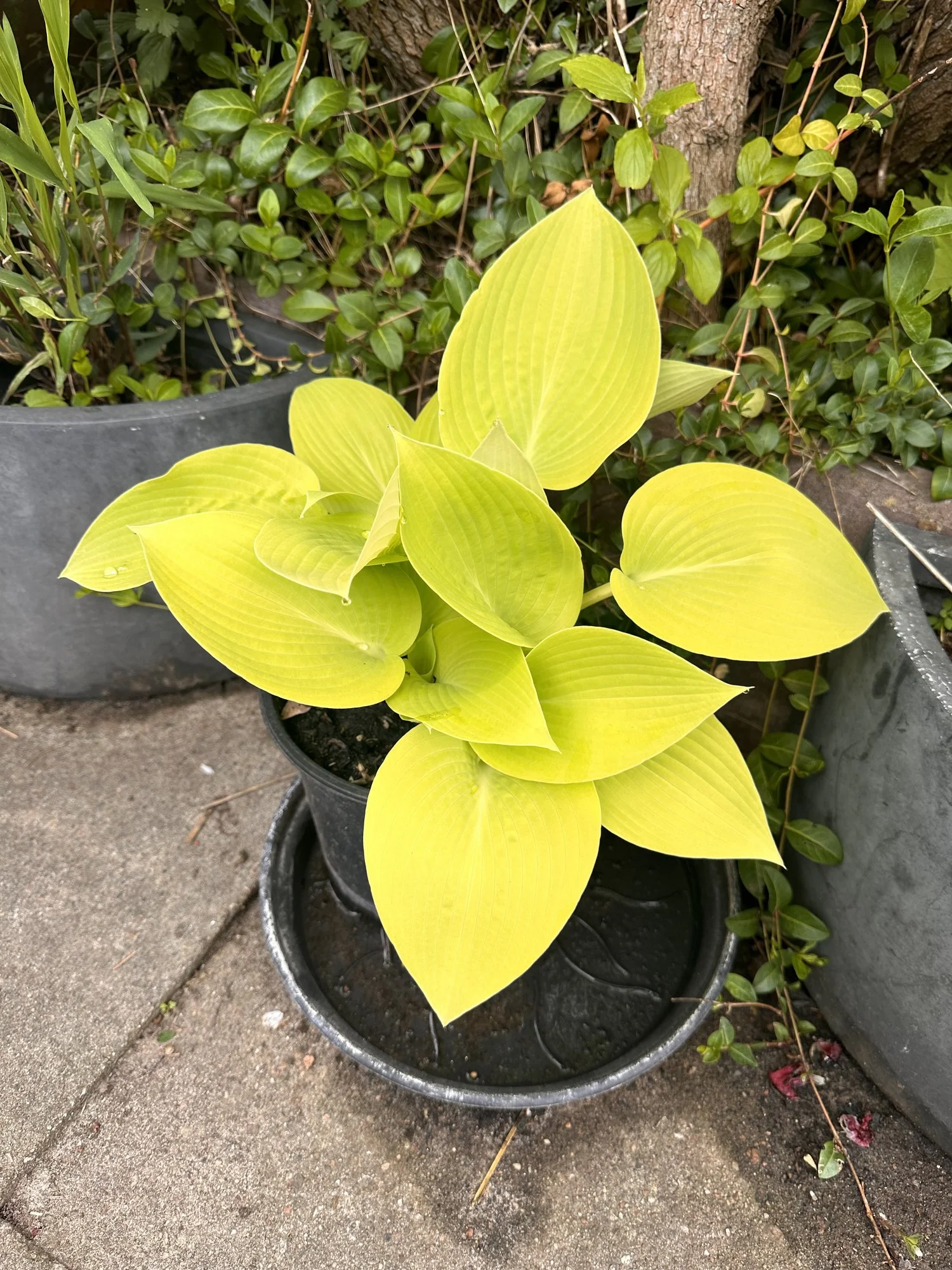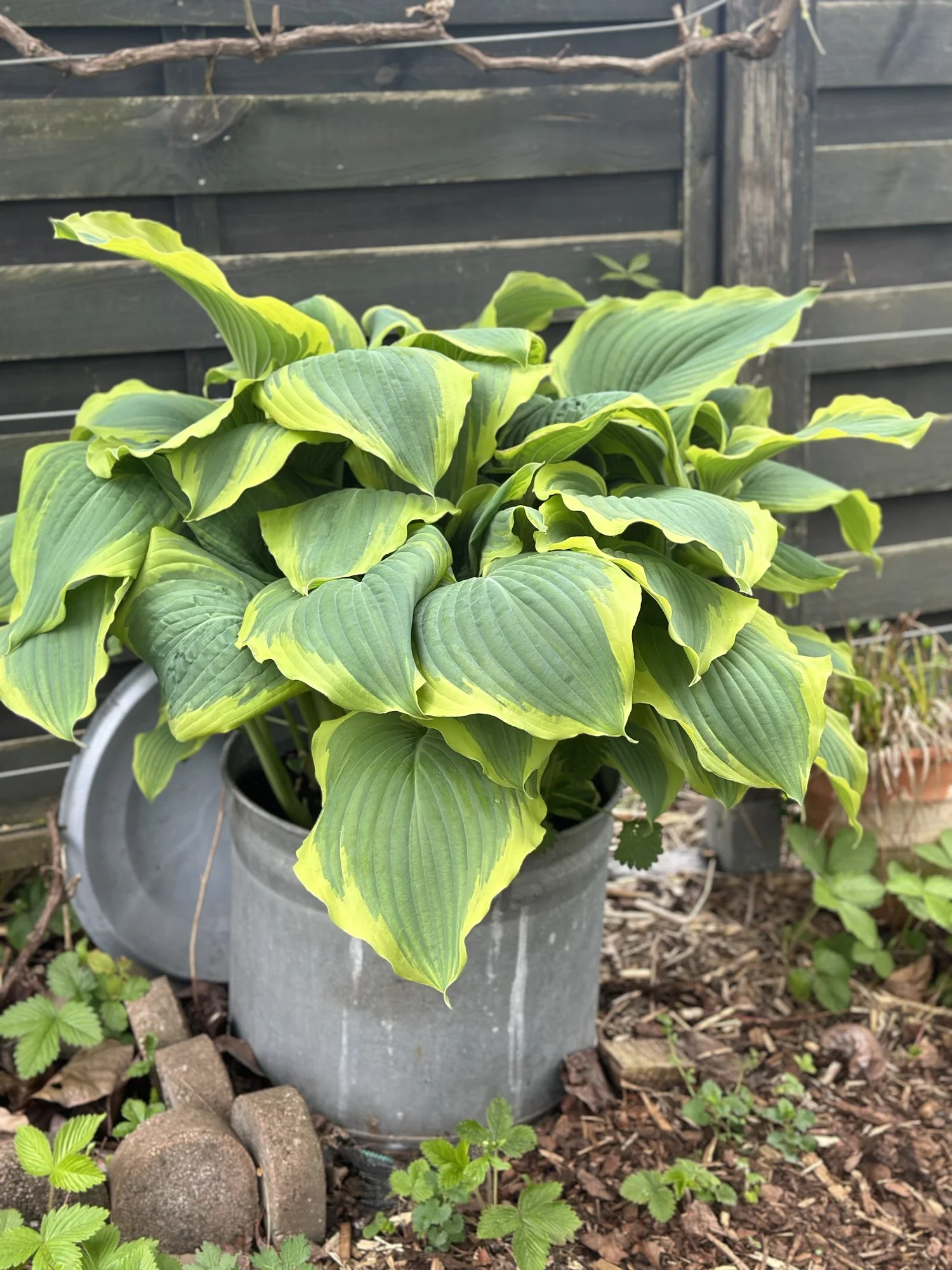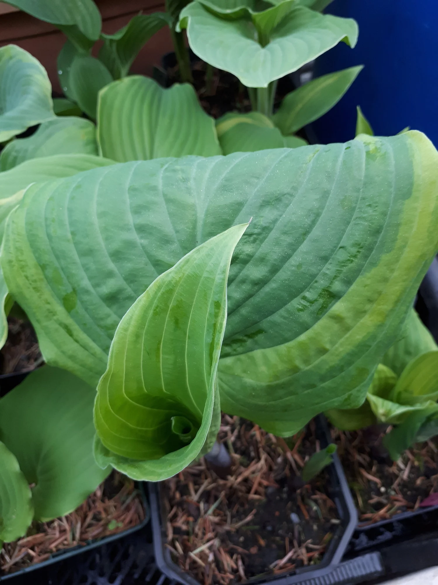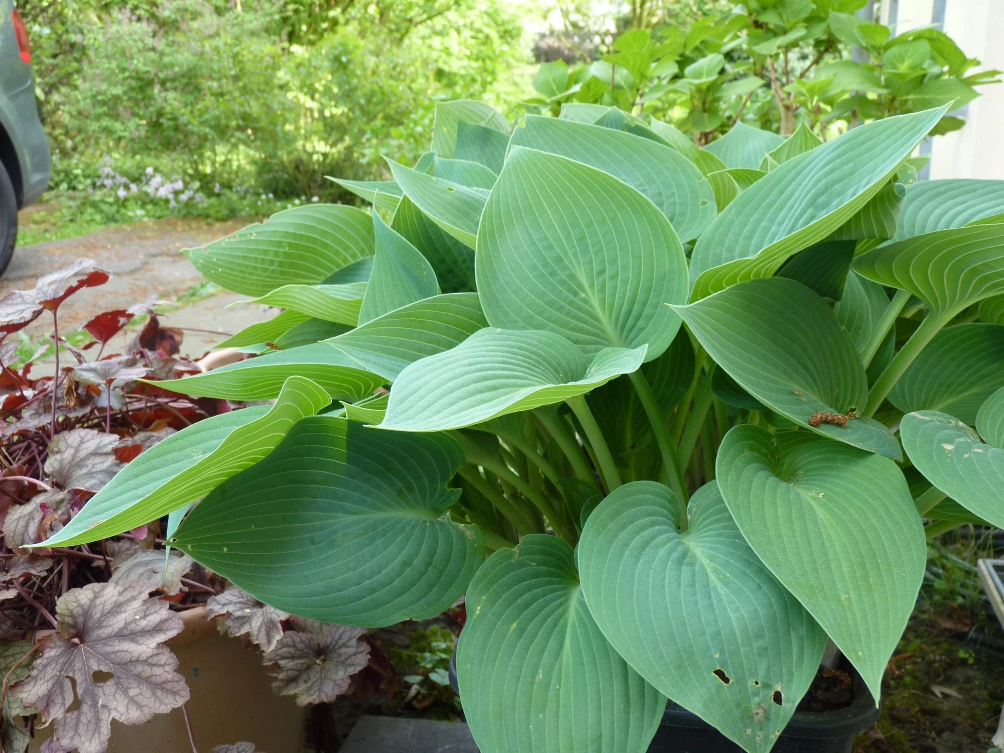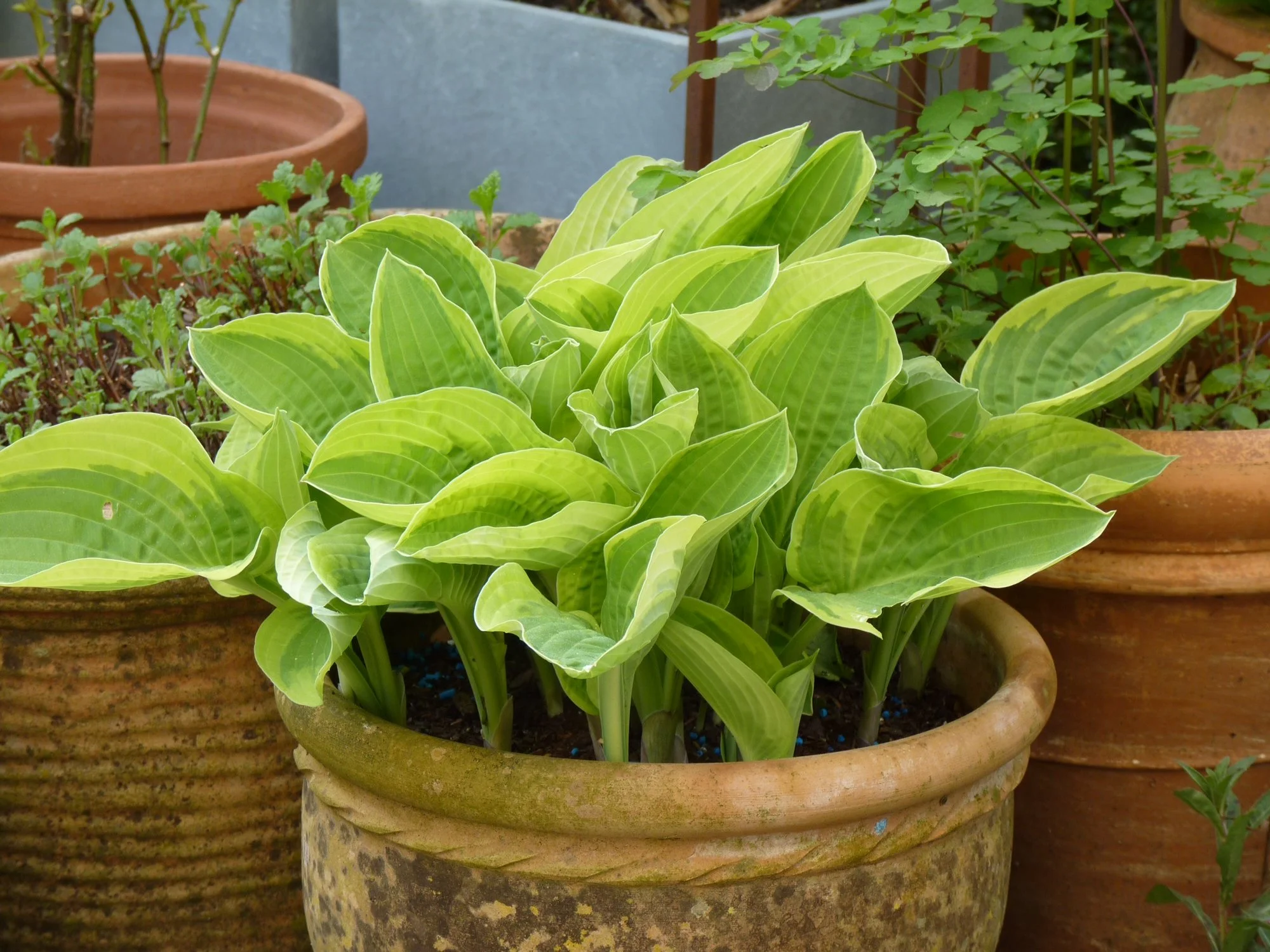 Meine Hostas in Töpfen habe ich weiterhin draußen stehen, auch wenn sie schon teilweise recht weit ausgetrieben sind, ja eine hat sogar schon eine Blüte angesetzt.