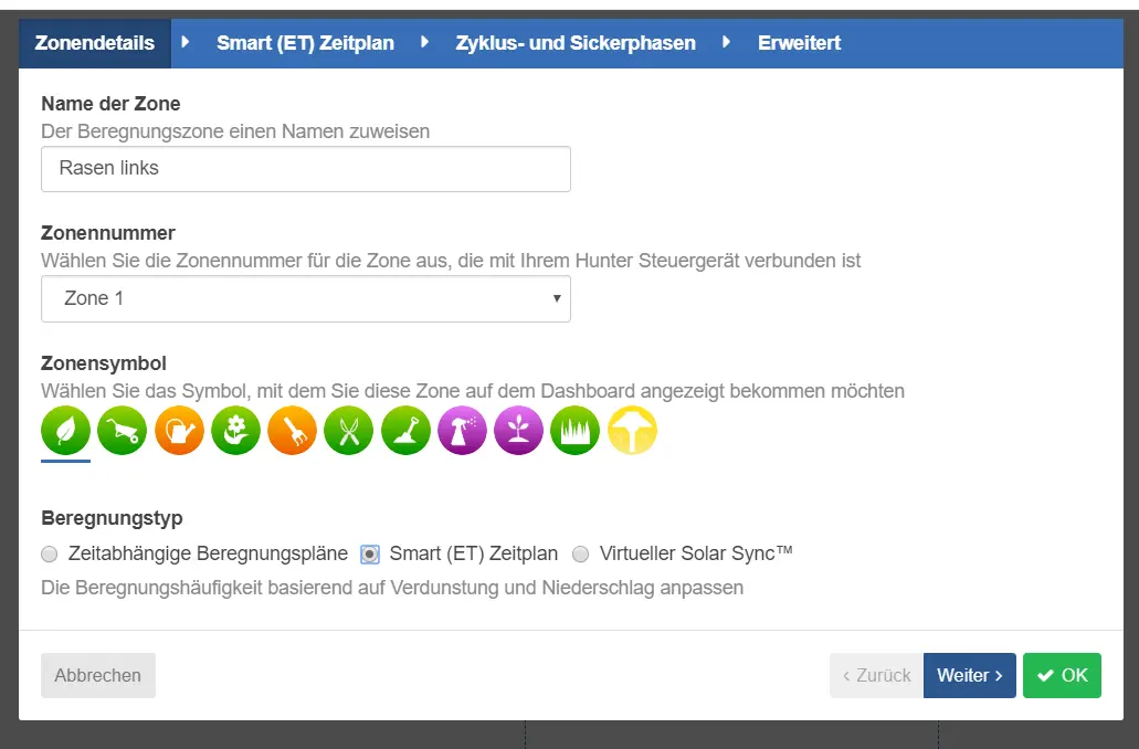 Es gibt noch -zig Optionen, um die Zeitplanung zu verfeinern. Wer sich das ansehen möchte: Man kann sich kostenlos bei Hydrawise registrieren und einen Controller anlegen ohne Seriennummer. Der arbeitet wie ein echter, lässt sich auch per App steuern, es kommt nur kein Wasser aus der Erde