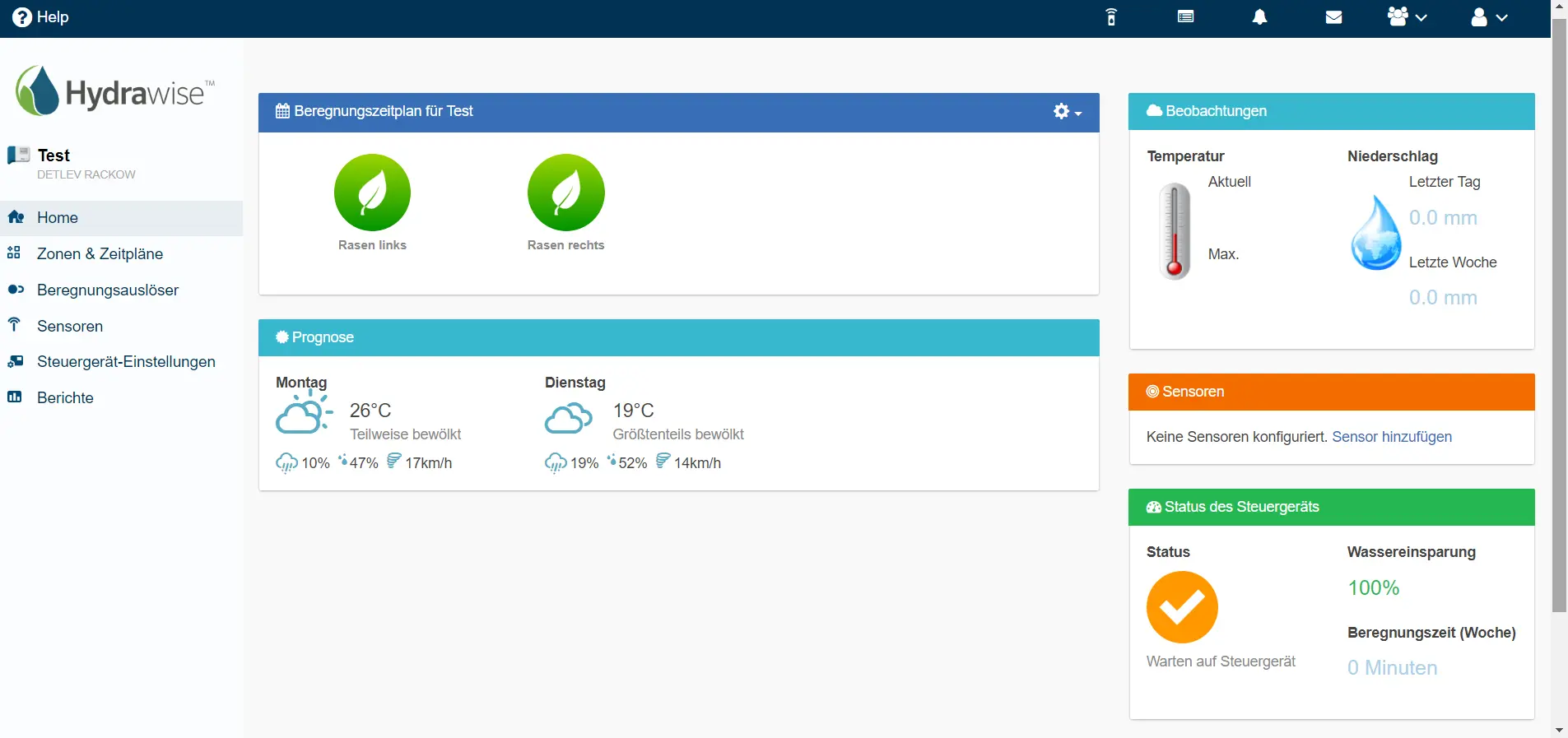 Einrichtung: Bei Hydrawise muss man sich ein kostenloses Konto anlegen, damit kann man bis zu drei Controller verwalten. Für gewerbliche Wartungsfirmen gibt es Konten bis 200 Controller, allerdings kostenpflichtig.