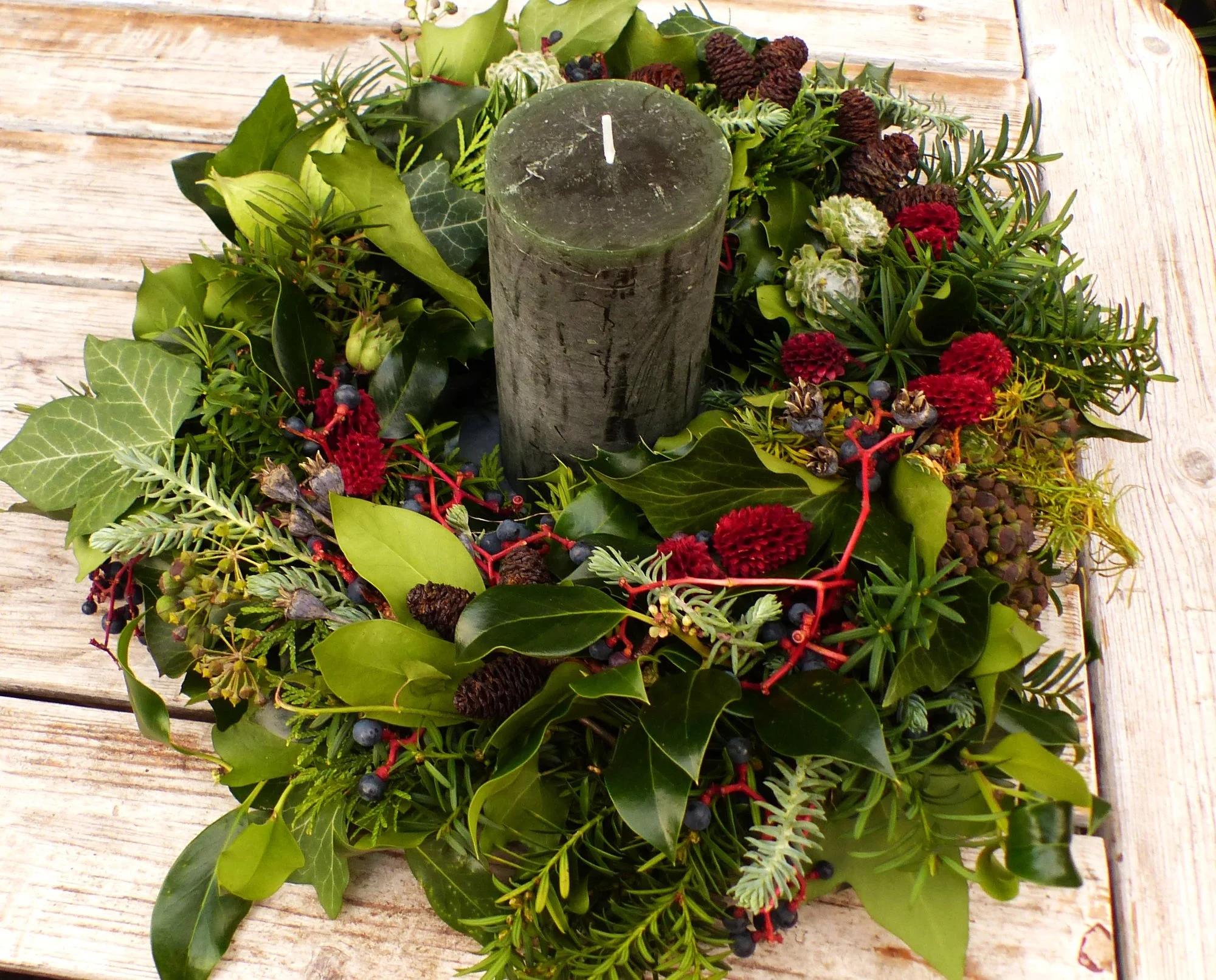 Ich weiss ja nicht, was du unter unbegabt verstehst, aber einen Tipp für unregelmässig gebundene Kränze hätte ich: Schimmernden Draht (kenne ich als Bouillondraht) oder ein schönes Band rumwickeln dressiert allfällige flüchtende Triebe recht gut. Habe vor ein paar Jahren mal einen leeren Grünen gekauft, weil ich im Lebensmittelbereich absolut keine Zeit für solche Spässe hatte. War schön gemischtes Grün aber etwas unordentlich gebunden. Als ich mit ihm fertig war sah er pikfein aus, nur wegen bisschen ganz dünnem Draht. Seither habe ich den immer in der Nähe wenn ich kranze, auch wenn es längst nicht immer nötig ist.aber unbegabt wie ich bin tät ich mich gern von deinen Kränzen inspirieren lassen