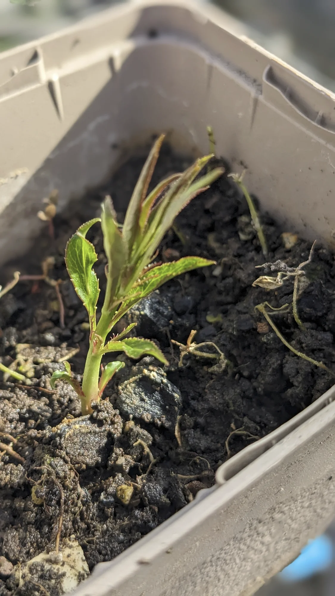 • PXL_20260328_080509108.PORTRAIT.webpaus 4 gesteckten Pfirsichkernen haben sich 2 geöffnet und ein Pflänzchen getrieben
