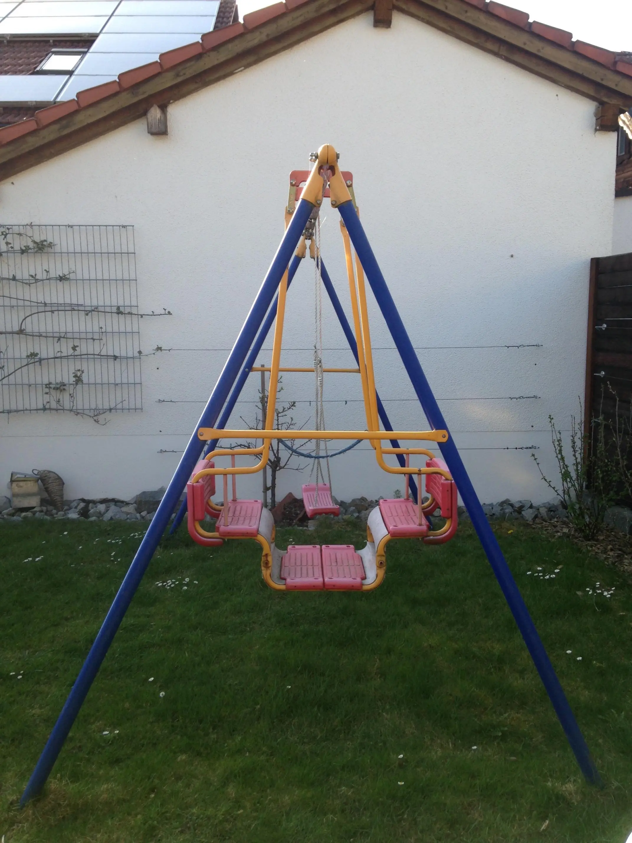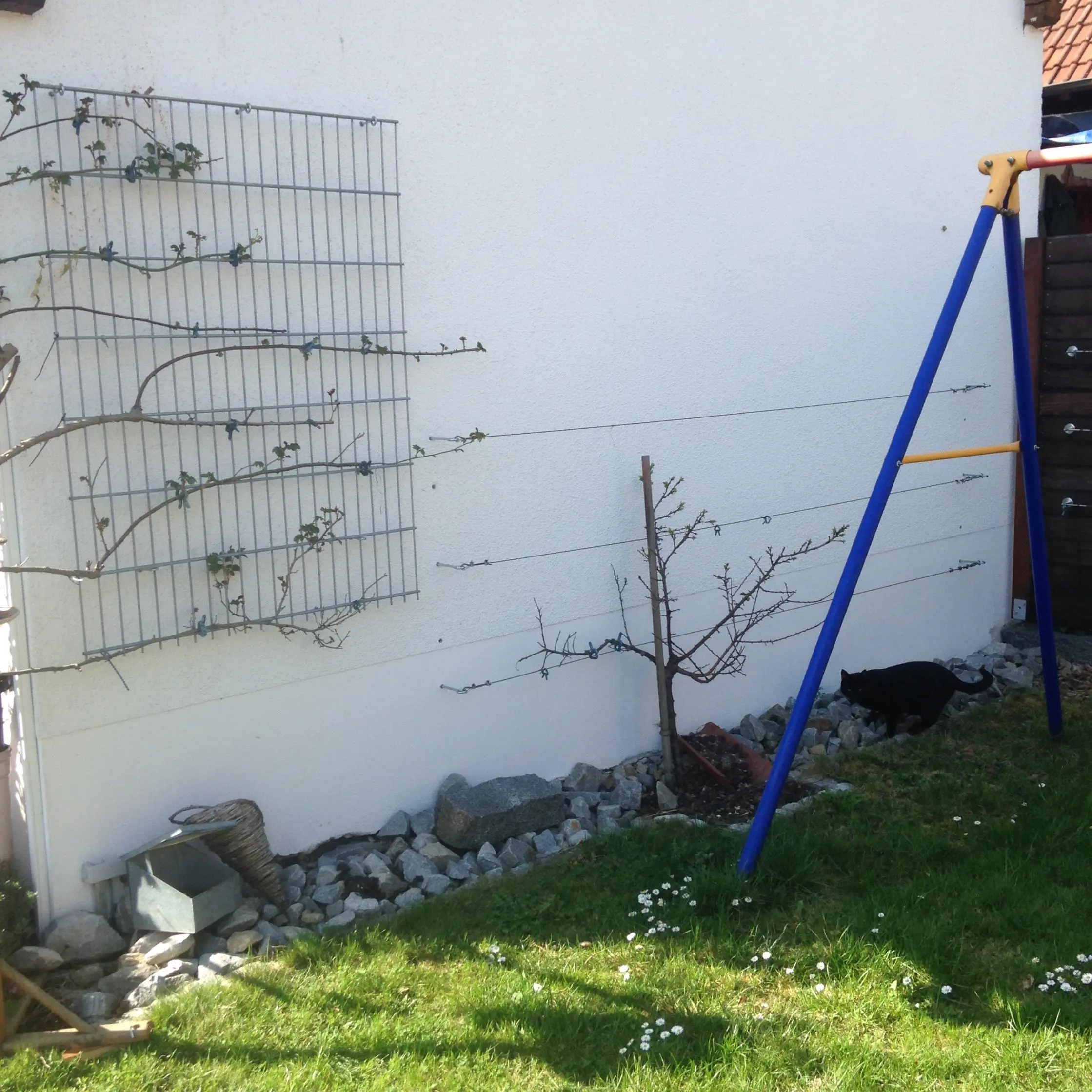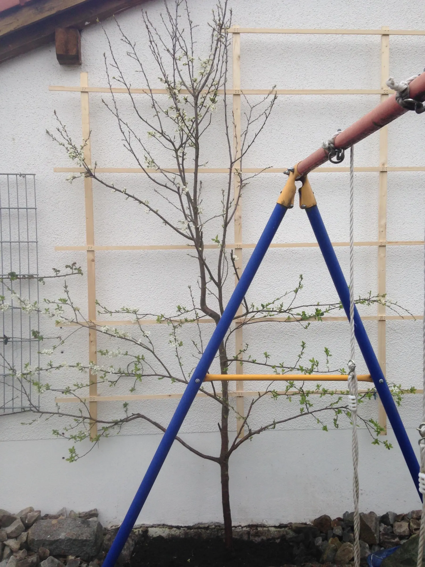Noch etwas: Wenn du die Zwetschge an die Garagenwand pflanzen möchtest, dann nicht zu nahe, da es sich ja um eine starkwüchsige Art handelt. Eher etwa 20 - 30 cm weiter von der Wand entfernt als der jetzige Aprikosenbaum. Dann müsstest du halt das Schaukelgestell, das man noch im Bild sieht, etwas verschieben.