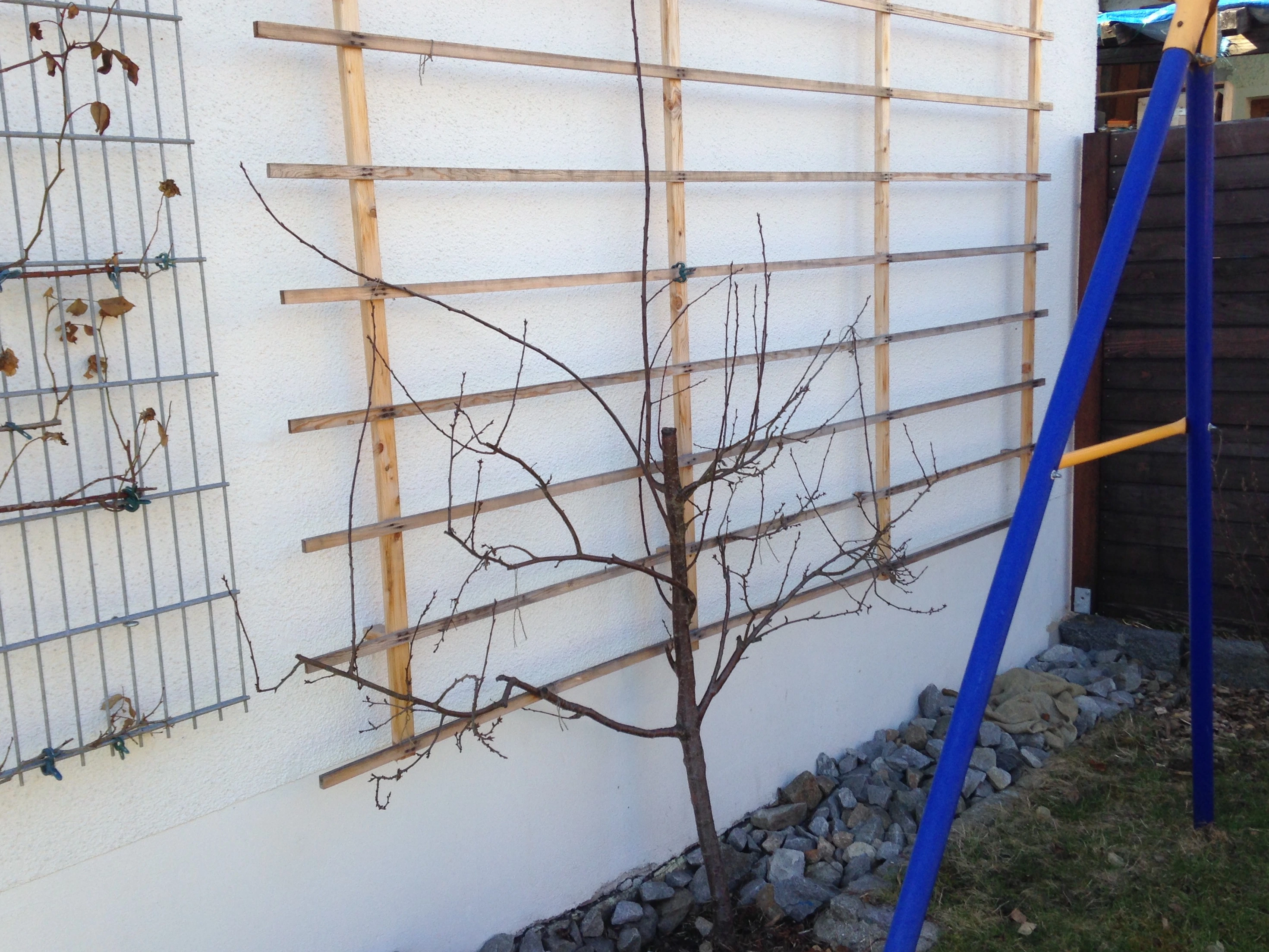 Ich hab ihn jetzt noch nicht festgebunden, da das Spalier noch weitere Zwischenhölzer bekommt.