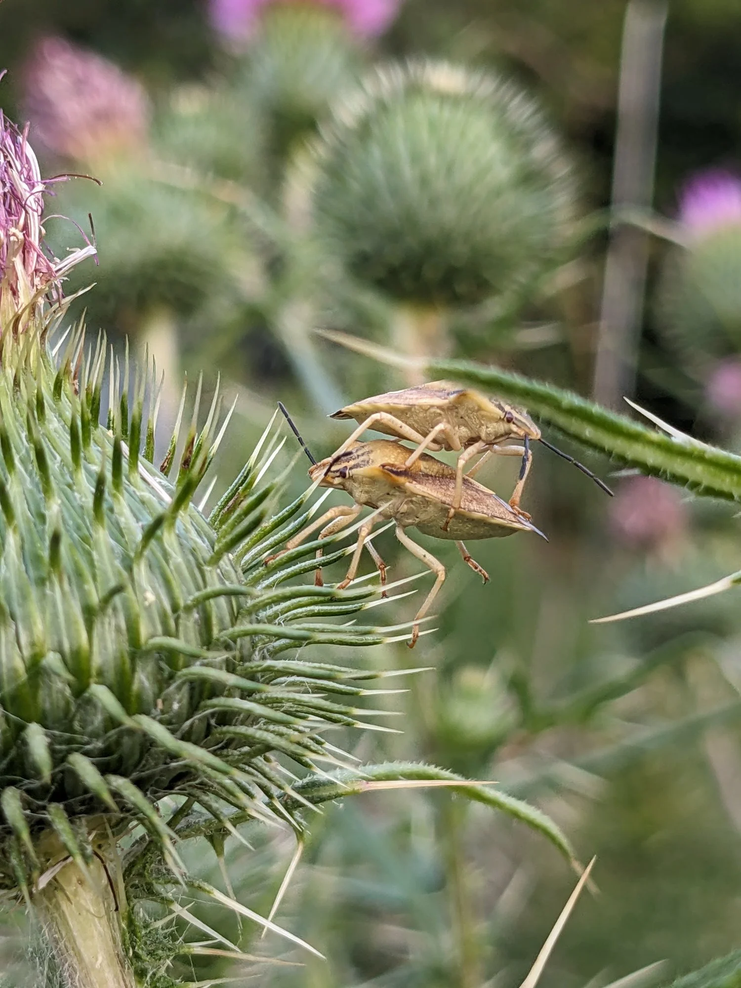 Geschafft! Die Wanzenmama lässt ihre zukünftigen Kinderchen im Stich, begibt sich auf die sonnige Seite des Blattes und hebt gleich darauf erleichtert ab.