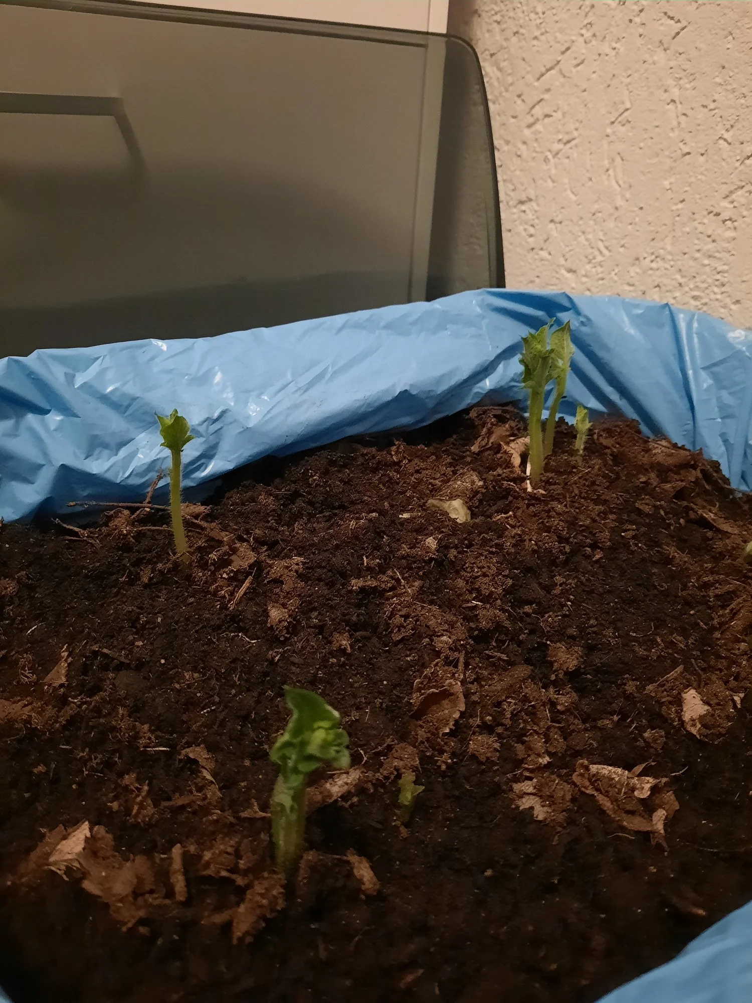 • Ok, nachdem das Thermometer gerade bei 8°C war habe ich die Kartoffeln doch rein geholt und wegen der Trauermücken raus in den Hausflur gestellt 😅