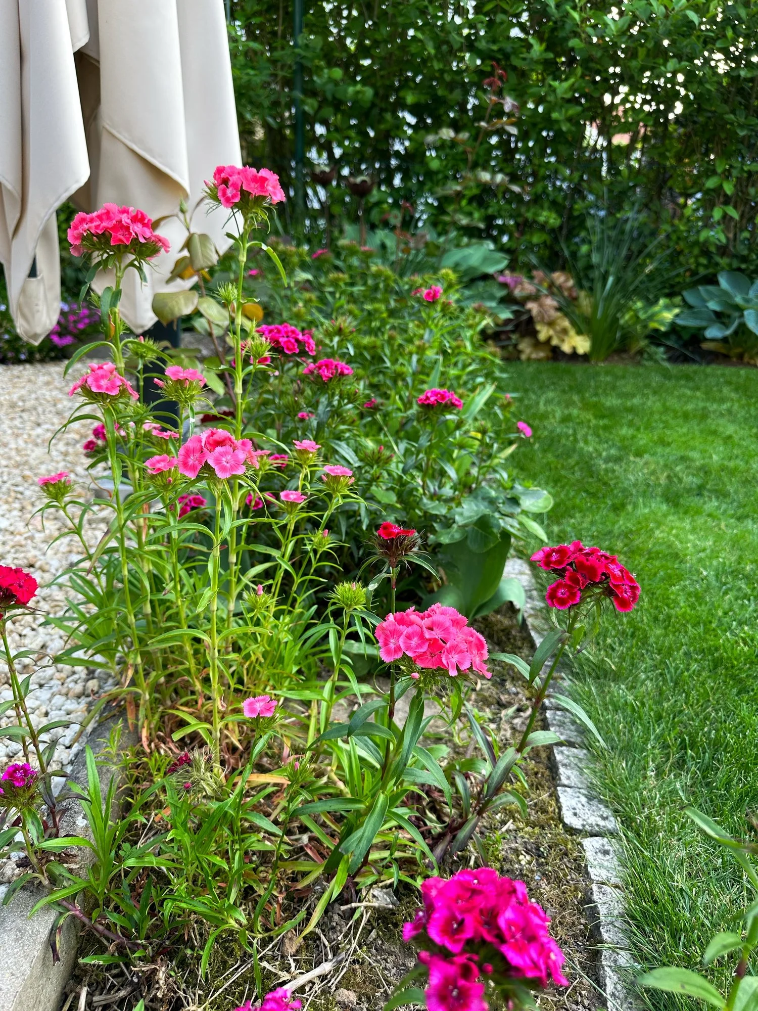 Neben an in den Beeten blühen jetzt die Pitchelnelken