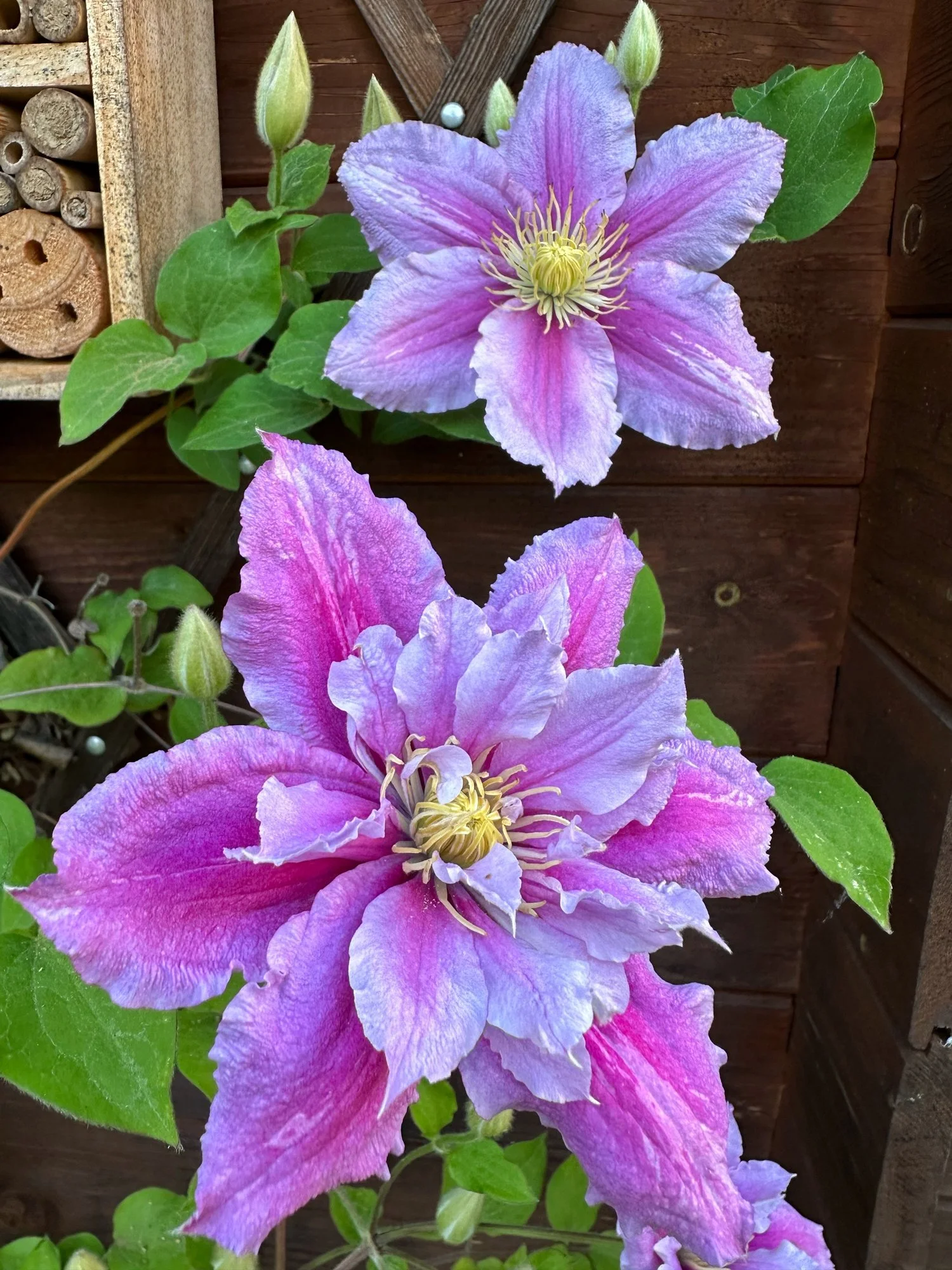 Und dann gibt es auch noch mehr Fotos, wenn die Sonne nicht so knallt. Meine Clematis am Gartenhaus steht voll in der Blüte, echt traumhaft. Sie hat auch wie jedes Jahr gefüllte und ungefüllte Blüten.