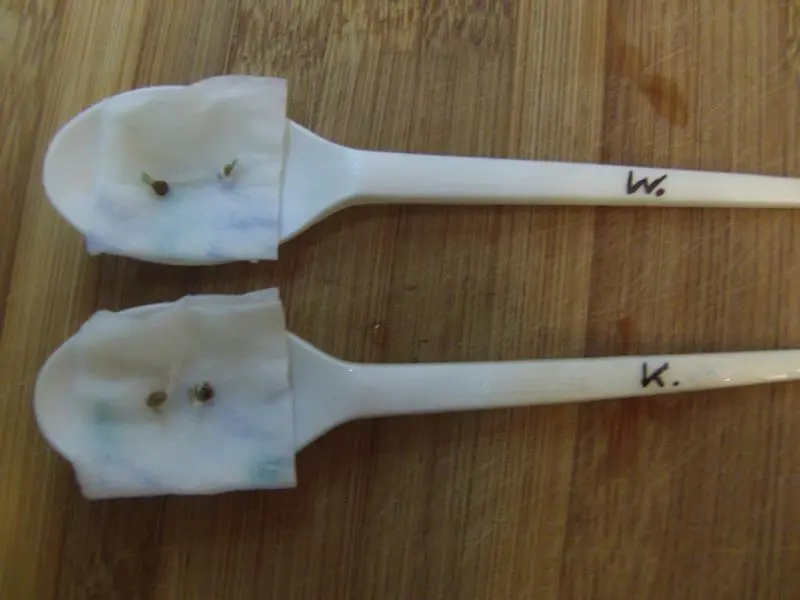 Ich habe eben doch noch Fotos gemacht: Links in dem Becher ist ein Jiffy mit dem heute gekeimten Winzling und rechts in dem größeren Gefäss die Große (gekeimt gestern).