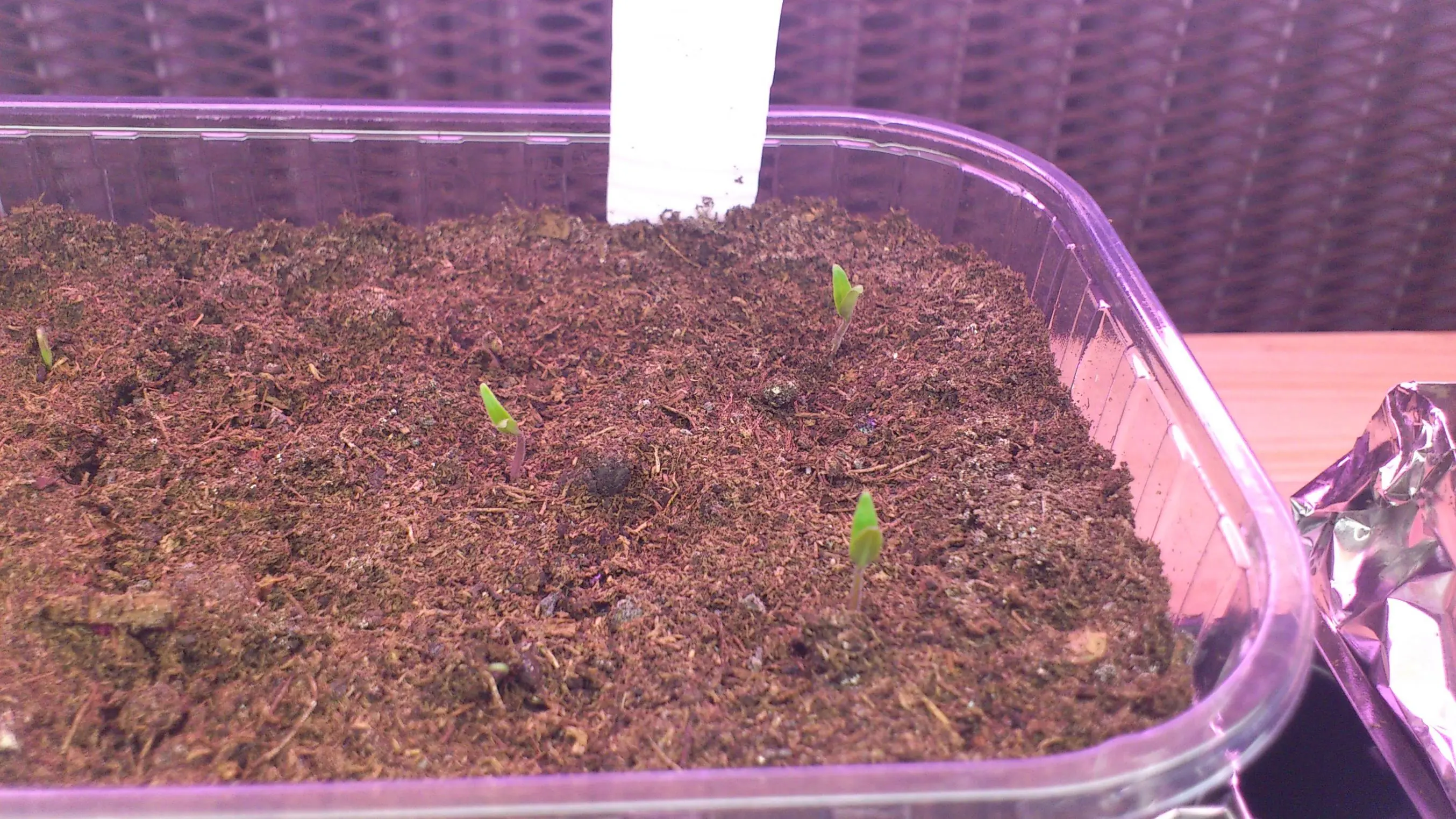 • Die Kleine kommt aus der Erde, boah ist die schnell (2 von 2 sind gekeimt). Aussat 15.1. abends. Erstes Auftauen aus der Erde: 19.1. morgens. Bild kriege ich leider nicht größer, dann wird es unscharf.