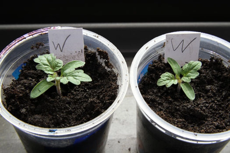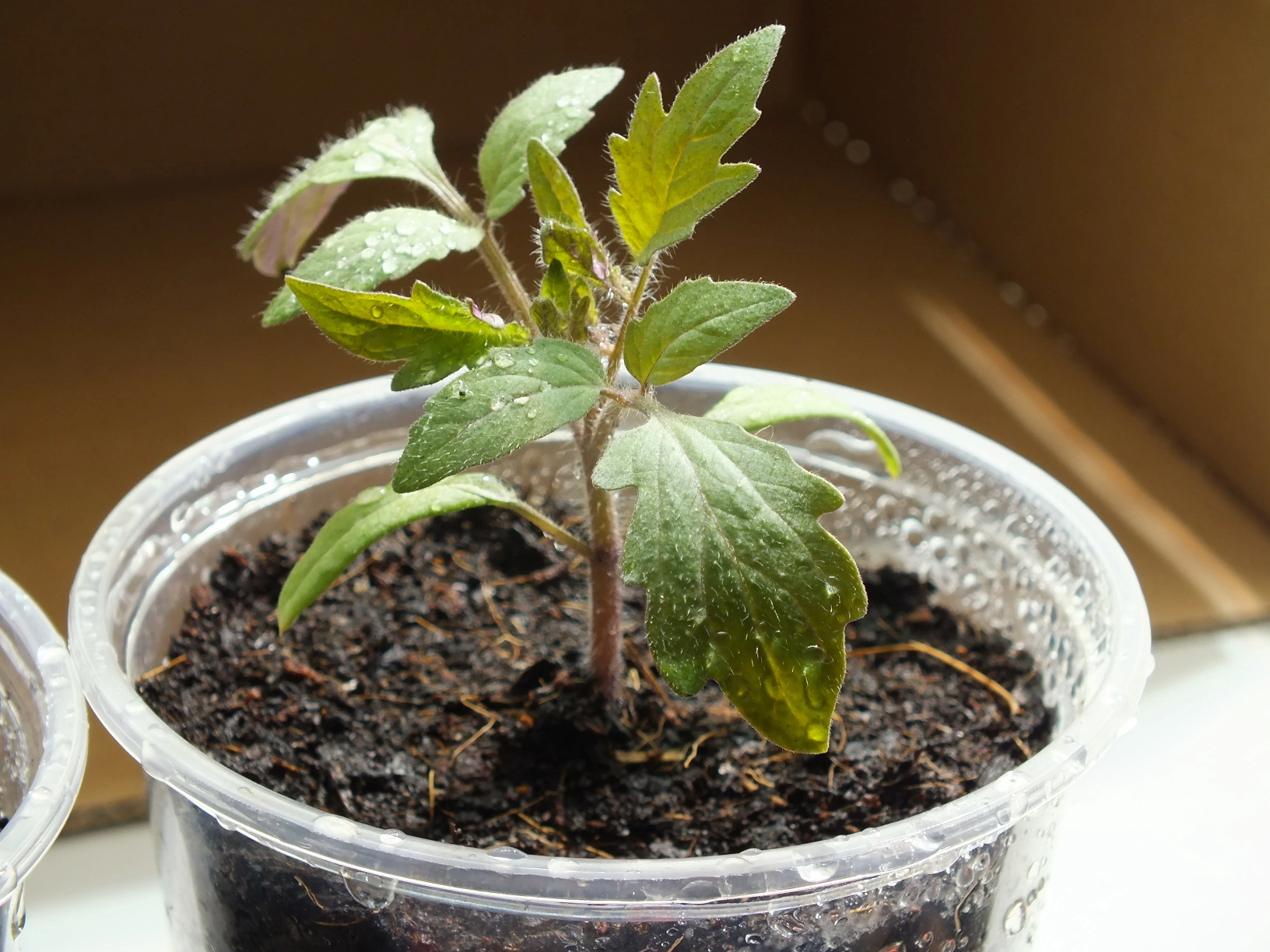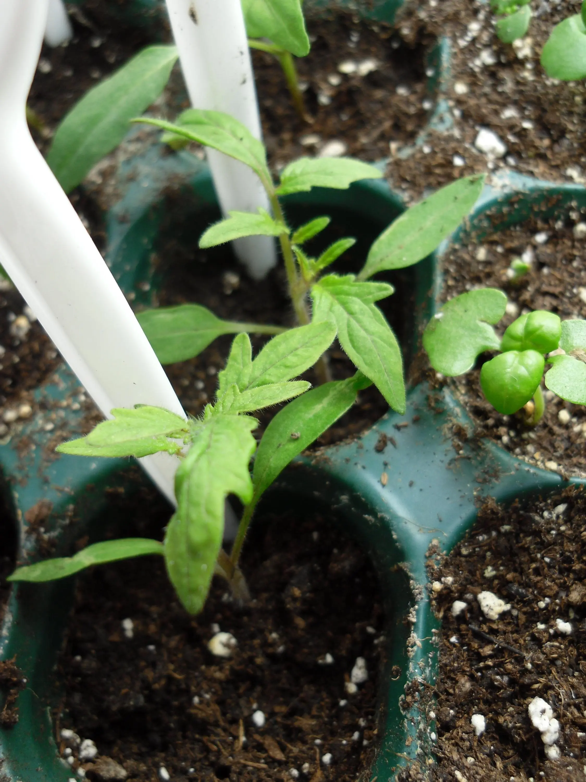 Klein ist seit einer Woche in Tomatenerde. Warum die Blätter so hell wurden? Vielleicht zu nass nach dem Angießen? Nährstoffmangel kann es nicht sein.