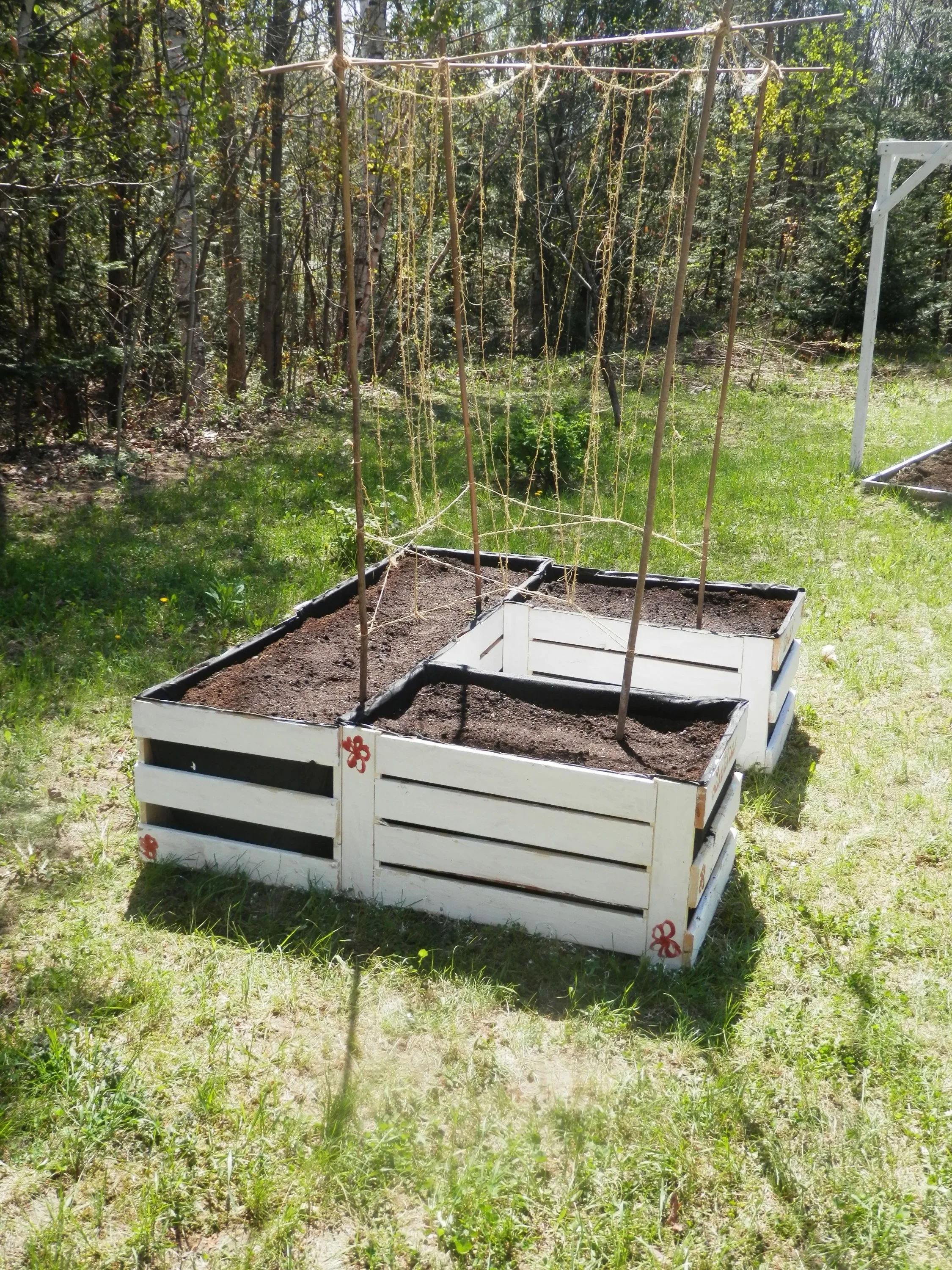 Das Wettbewerbsbeet für meine Kids ist auch fertig, es wird eine Bohnenpagoda, und nebenbei ist auch noch Platz für Tomaten und anderes "Gestrüpp". Die Auswahl sollen meine Kinder treffen. Rosa Blumen müssen dabei sein, das hat das Tochterkind beschlossen. Sie haben das Beet mit unserer Hilfe selber gebaut und alleine gestrichen - die Beiden sind unglaublich stolz.