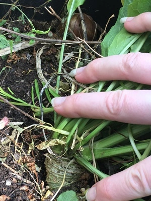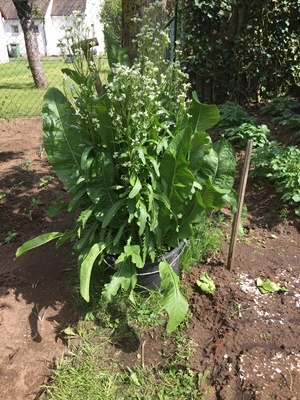 Hier nun die Meerrettichkübel im Beet bzw der Kree (wie wir sagen), wie er sich drin macht...