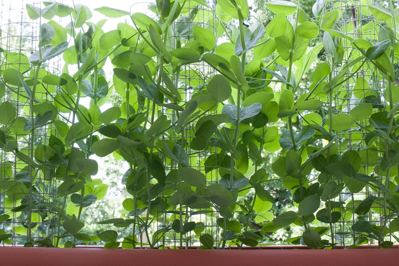 Die Zuckerschoten wachsen über ihr Gestell hinaus und haken sich fest, wo auch immer sie etwas zum Umschlingen finden. Und auch sie saufen wie ein bodenloses Loch. Da kann man quasi zusehen, wie die Erde austrocknet.