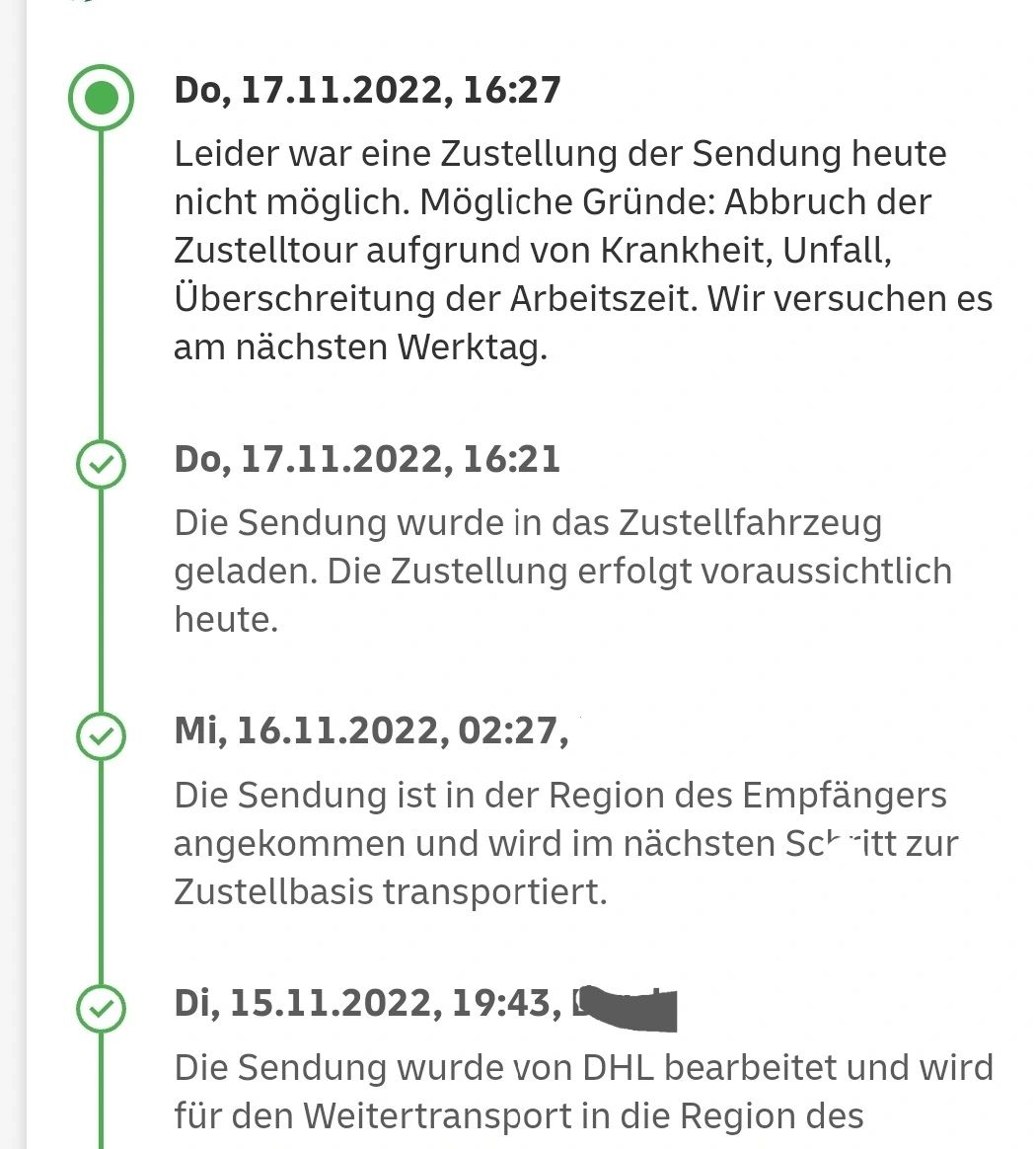 Exakt dieselbe Angabe wie bei ihr - wurde gestern eingeladen und sollte zugestellt werden, Abbruch der Zustellung wegen Erkrankung des Fahrers oder irgendwelchen anderen Gründen.