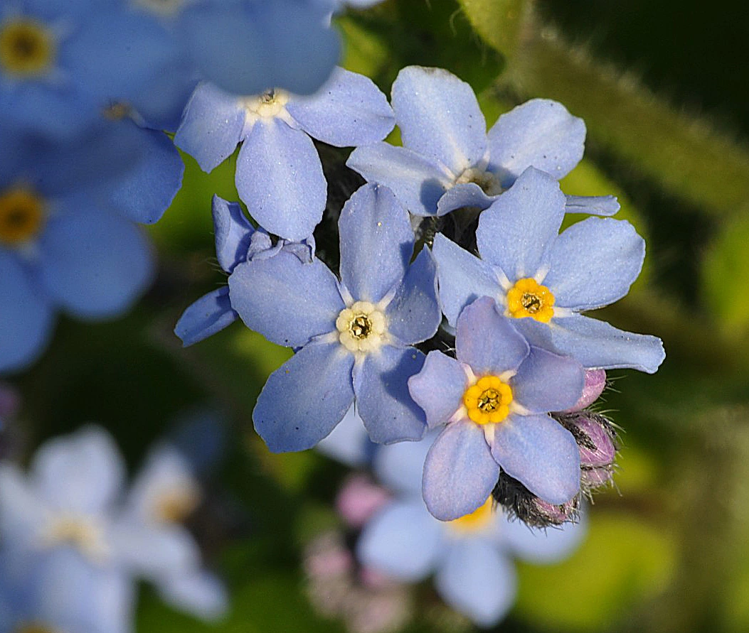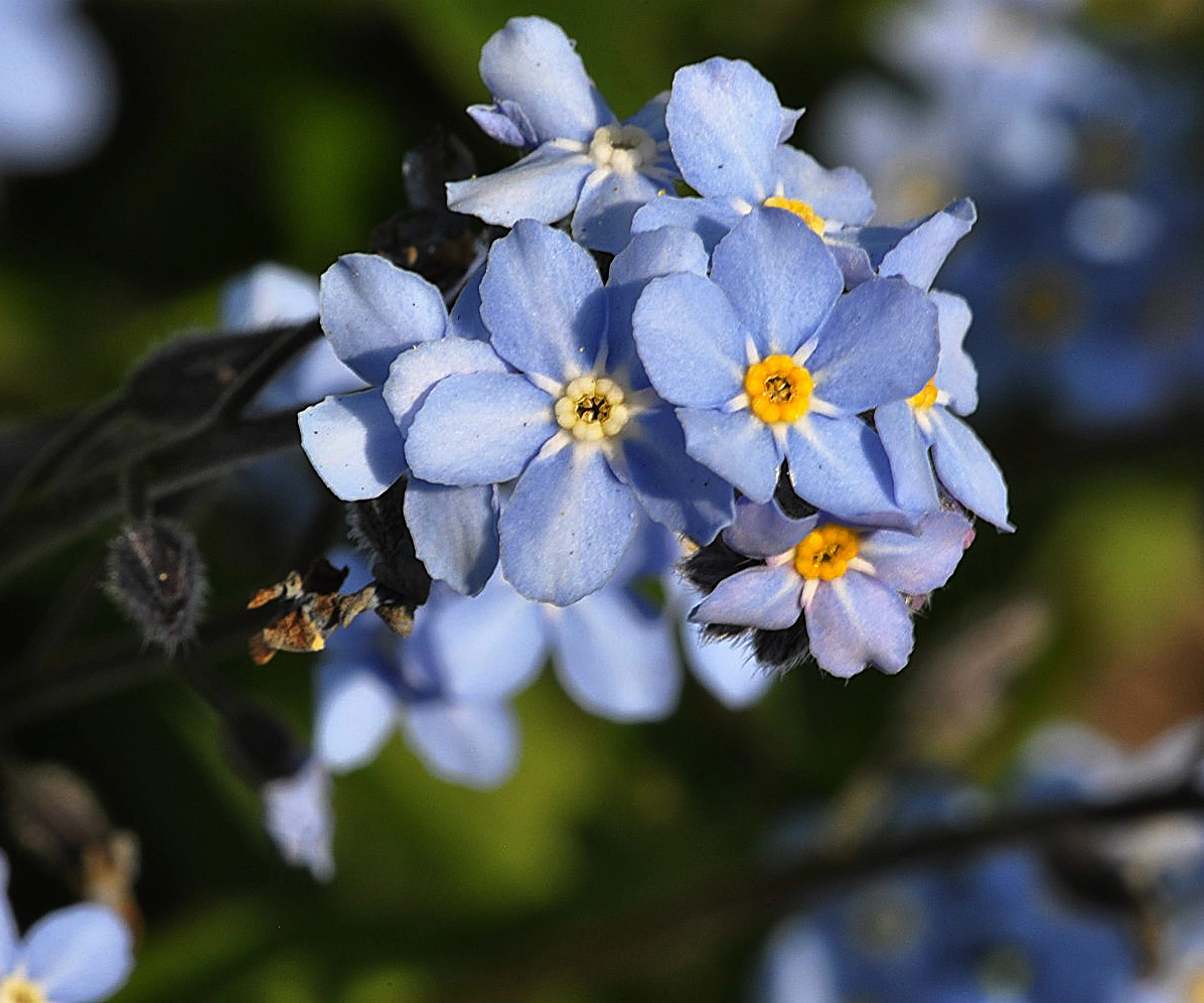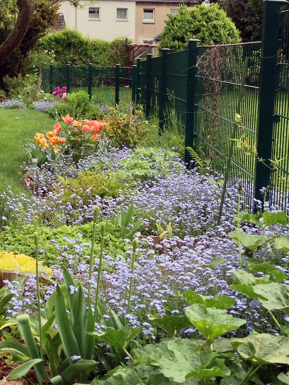 Aktuell zur Zeit ist sowieso keine Erde mehr zu sehen: wo noch keine Staude sich breit gemacht hat, stehen Vergißmeinnicht und verwandeln den Garten in ein blaues Meer. Toll. Etwas "hässlich" ist das Grünzeug der verblühten Krokusse, Narzissen und Tulpen, aber ein Weilchen muss man es damit noch aushalten. Es gibt Schlimmeres.