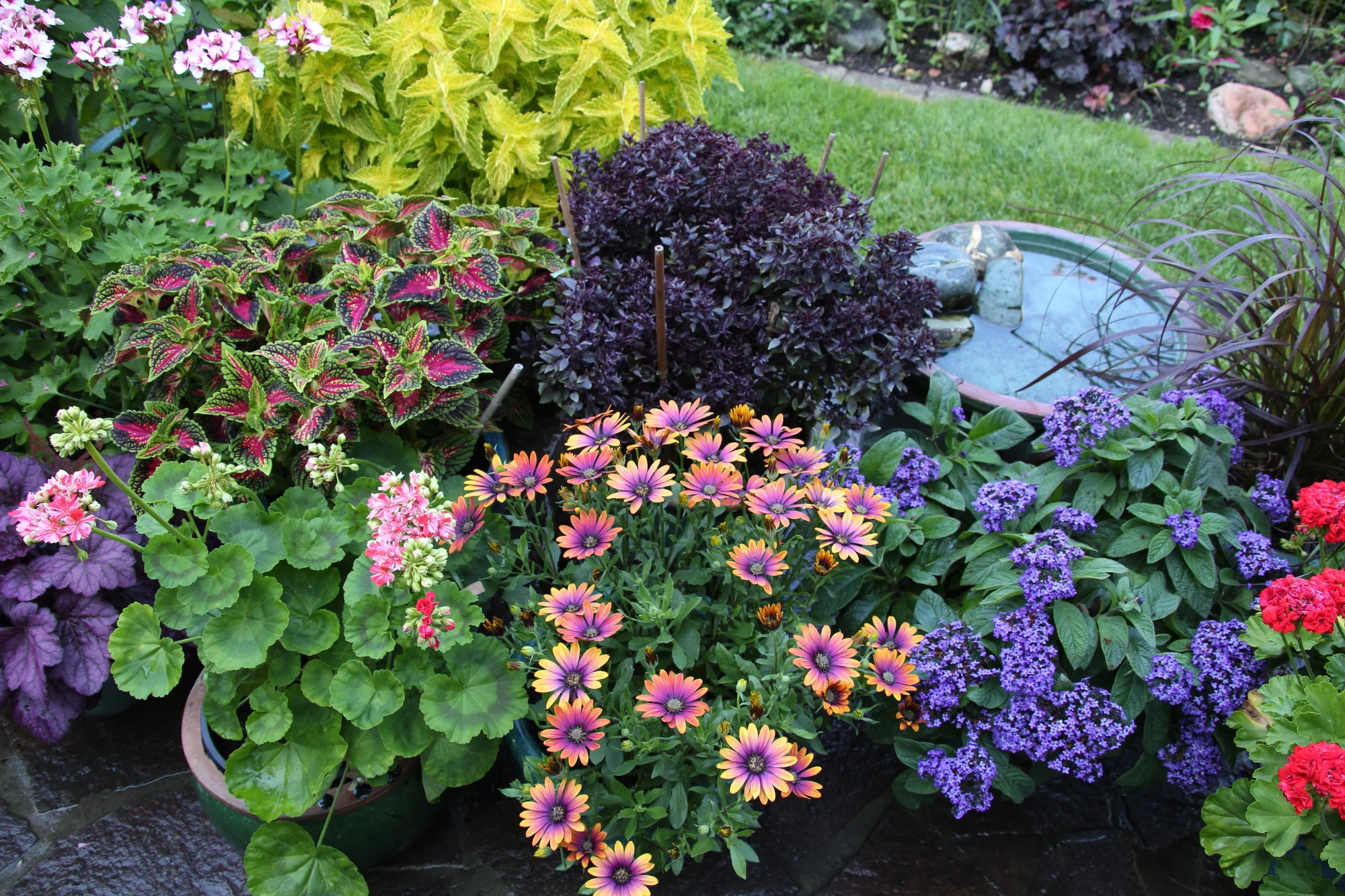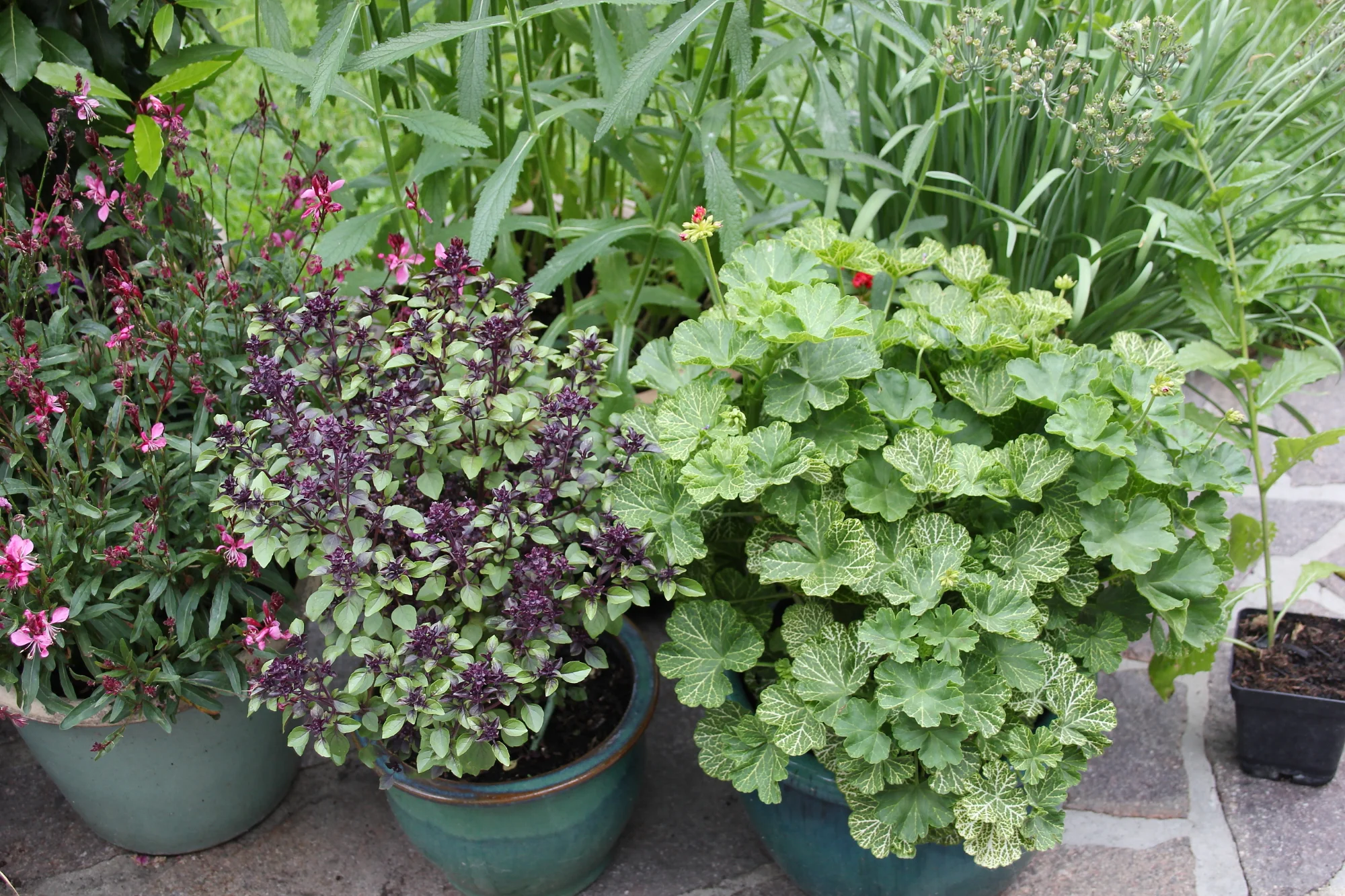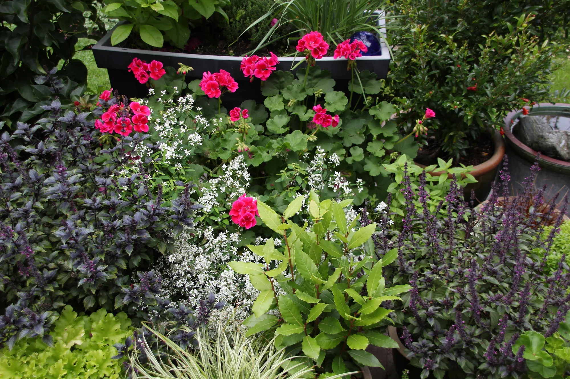 Ich pflanze mir ja immer das Wildbasilikum auf die Terasse. Das zieht Insekten an, die man sonst nie sehen wĂŒrde. Das ist die dunkelrote Pflanze im Hintergrund.