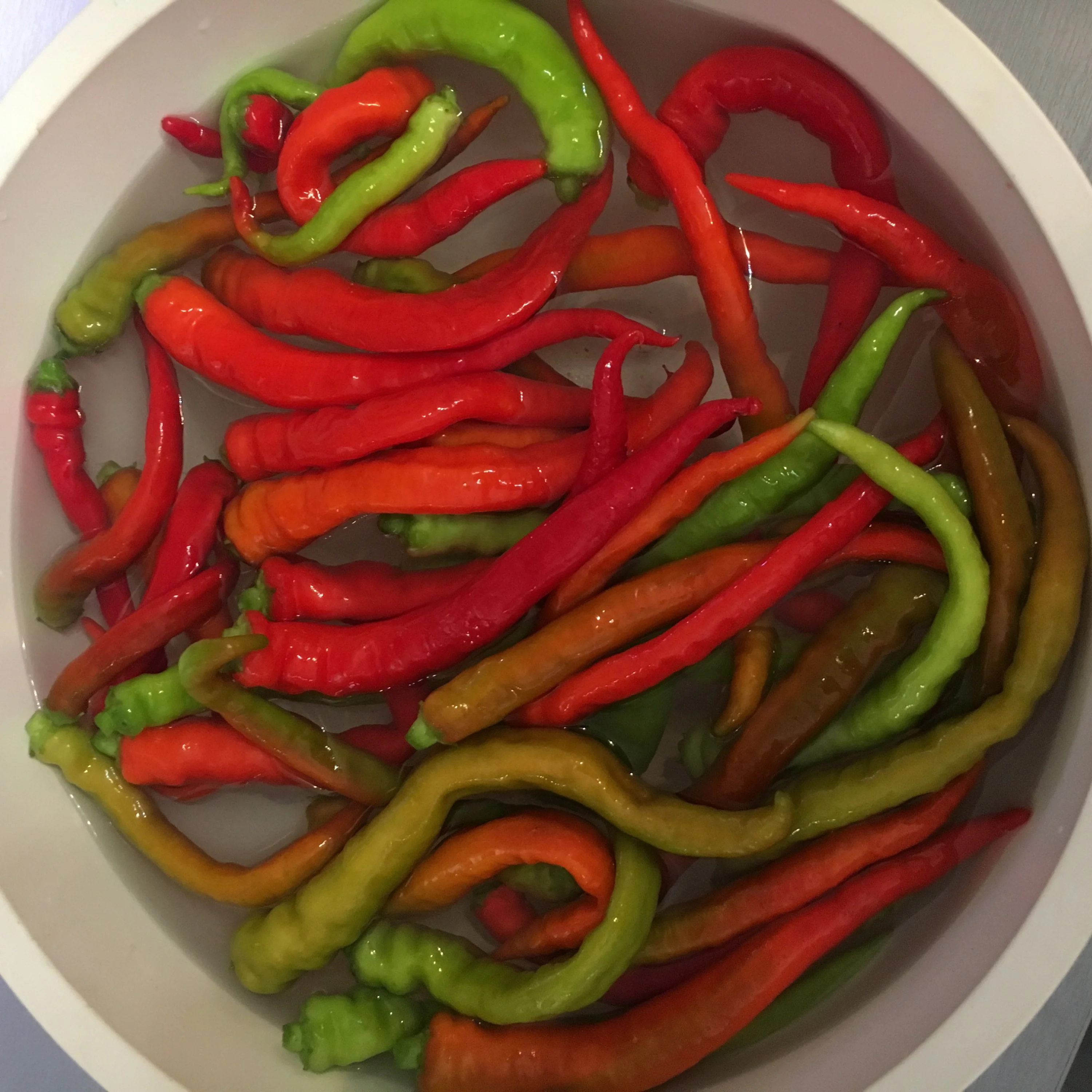 Gestern habe ich fast alles abgeerntet und nun möchte ich die ungefähr so einlegen, wie man sie oft als ganze Schote als Beilage beim Griechen/Türken bekommt - mmmhh schmakofatz.