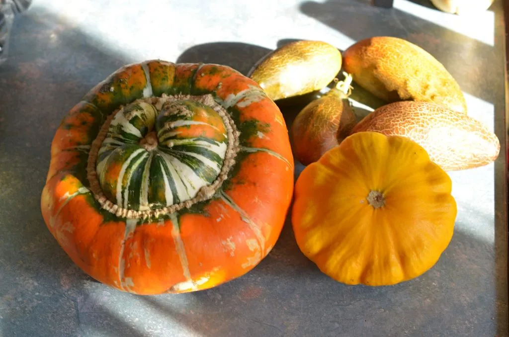 Heute habe ich einen Kürbis geerntet, den ich nie und nimmer gesät habe. Jedenfalls nicht absichtlich. Da er aber in einem Schneckenring wächst, werde ich wohl eine Pflanze dahinein gesetzt haben. Nur sollte das bestimmt ein ganz anderer Kürbis werden. Gesät habe ich Bischofsmützen, so wie der links auf dem Bild.