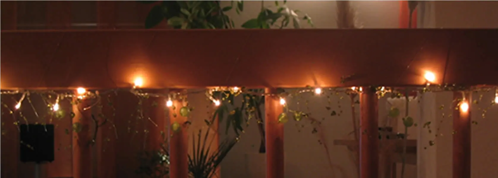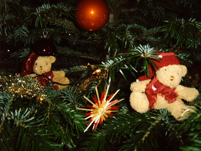 Bei uns: immer echter Baum, immer echte Kerzen, Schmuck traditionell in Gold/rot/Holz.