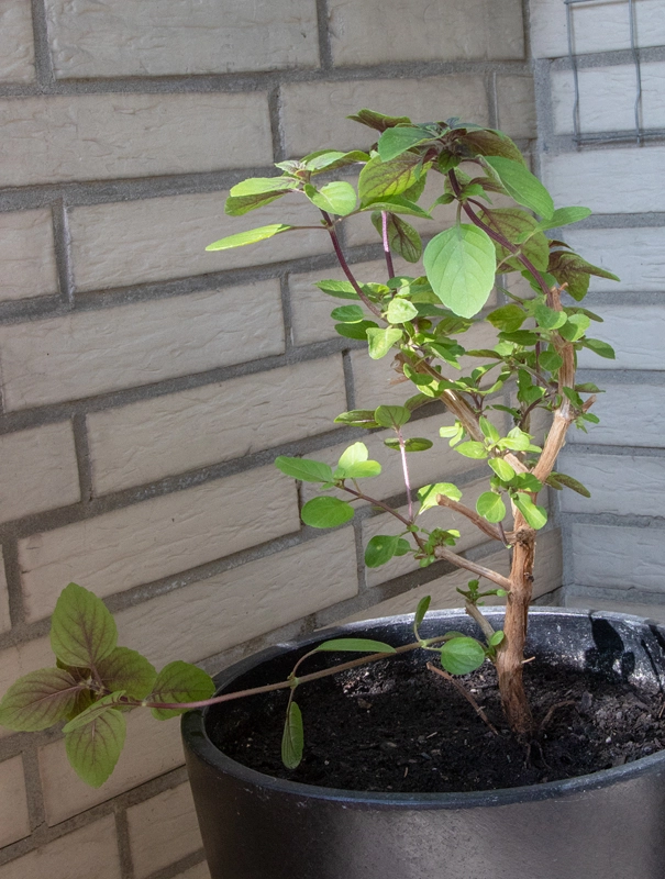 @schreberin: Ich überwintere das rote Basilikum jetzt zum vierten Mal, glaube ich. Damals las ich, dass Strauchbasilikum bei 10 - 15 Grad hell überwintert werden sollte, was in unserem Treppenhaus ganz gut funktioniert. Es verliert zwar meist sehr viele Blätter, der Großteil davon dürfte aber weniger am Licht liegen, sondern schlicht daran, dass ich die Pflanzen gerne mal vergesse und zu spät gieße. Es nervt dann zwar, die Blätter auffegen zu müssen, den Pflanzen selbst machte es bisher aber nicht viel; sie trieben im Frühling immer wieder gut aus, auch aus den bereits verholzten Trieben. In den letzten Jahren erntete ich einfach noch einmal ganz normal und stellte die Töpfe anschließend ins Treppenhaus. Beim Ernten schneide ich immer die lang gewordenen Triebe so weit zurück, dass sich die Pflanze später gut verzweigt und schön buschig wird. Dieses Jahr habe ich die Pflanzen erstmalig deutlich stärker zurückgeschnitten, damit sie oben herum nicht so viel Platz einnehmen. Den einen Topf hatte ich letztens ja schon mal gezeigt: