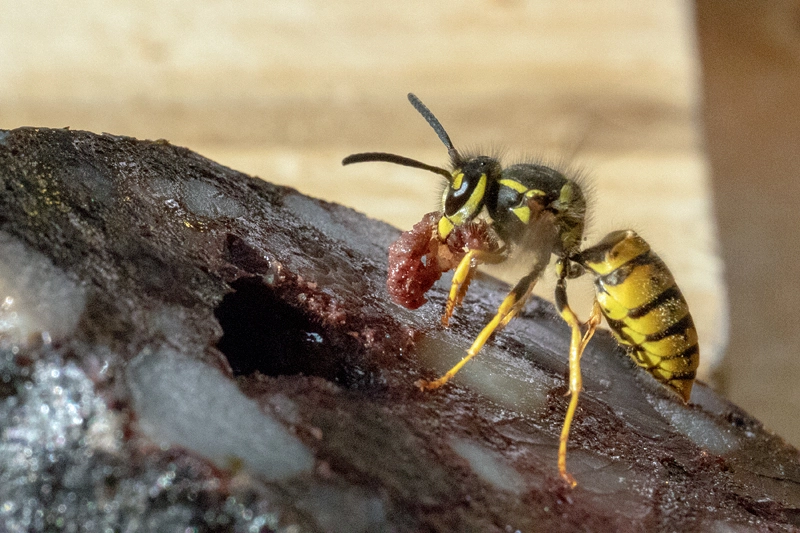 Die Wespe ist irgendwie immer passend da, wenn wir draußen essen und ganz wild auf Wurst und Fleisch. Hier beim Sammeln von Blutwurst.