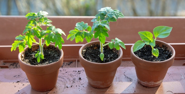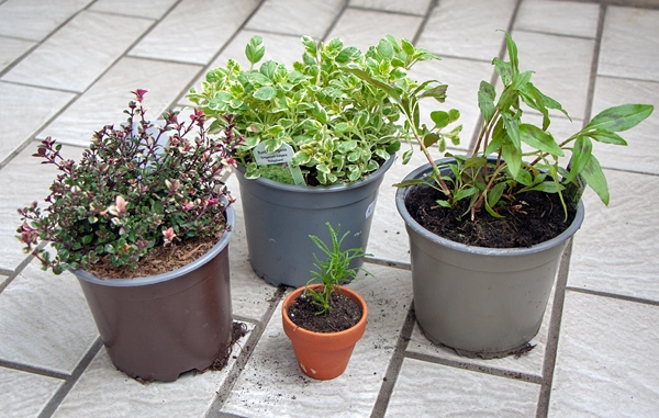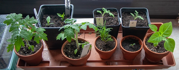 Auf den beiden hohen Töpfen sonnen sich momentan der Spinat und die Schale mit den Frühlingsblühern aus dem letzten Jahr.